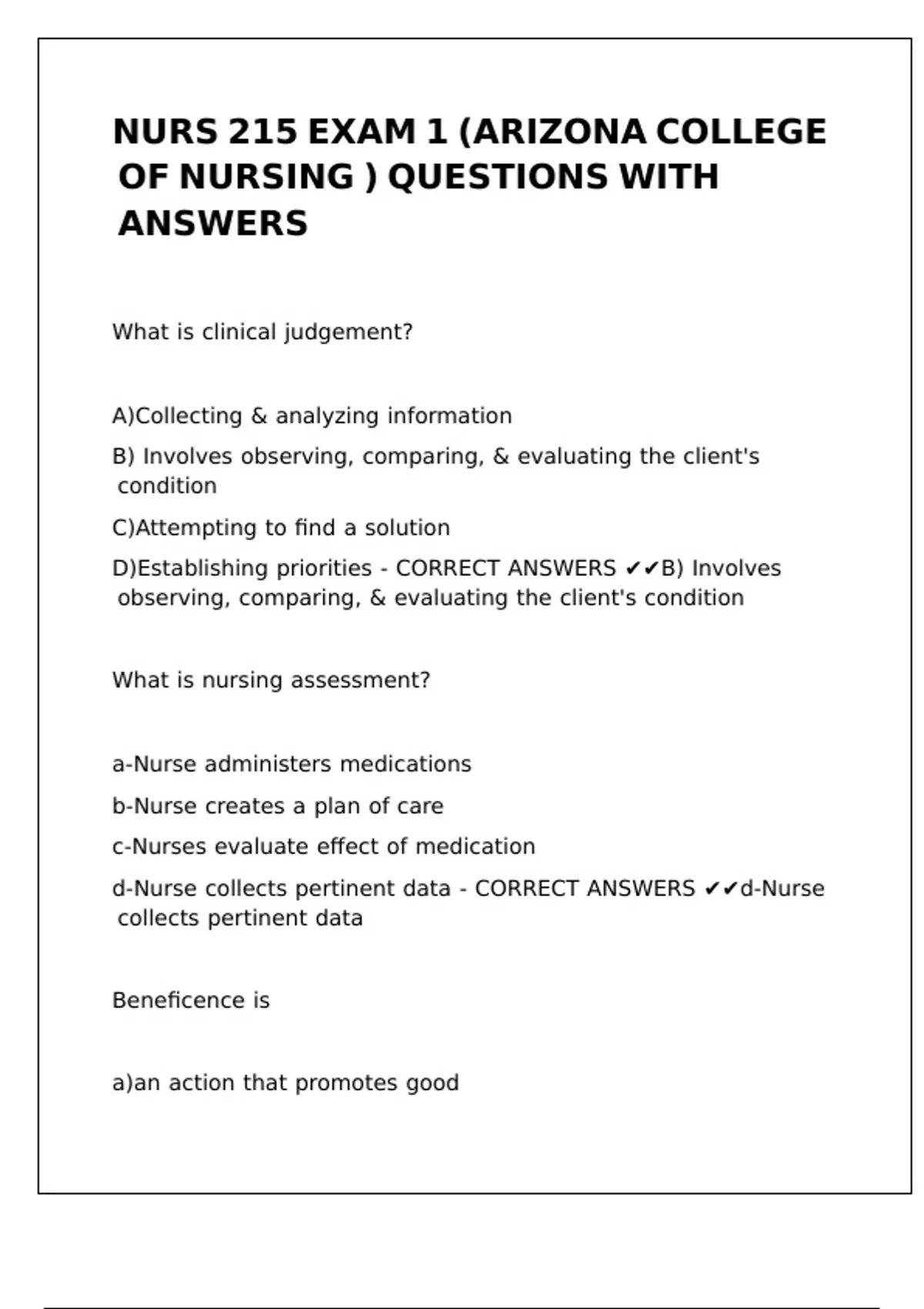 NUR 215 Exam 1 QUESTIONS WITH ANSWERS