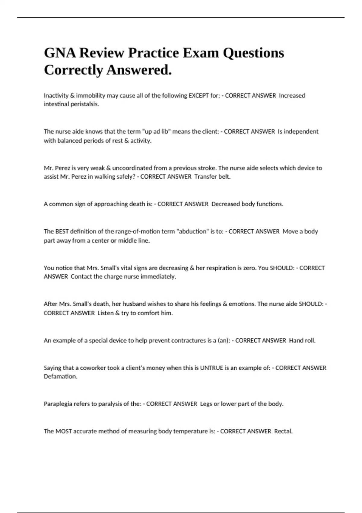 Exam (elaborations) CNA/GNA Practice: Basic Nursing Skills 3 Study Guide. Exam (elaborations) CNA/GNA practice: Basic Nursing Skills 2 Questions & Answers. Exam (elaborations) CAN Final Exam Review 100 Questions Correctly Answered & Updated. Exam (elaborations) CNA/GNA Practice: Basic Nursing Skills 5 Review Exam Questions & Answers. Exam