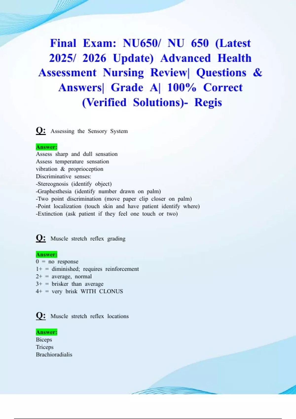 Exam 1,Exam 2,Exam 3 & Final Exams: NU650/ NU 650 (Latest 2025/ 2026 Updates STUDY BUNDLE PACKAGE WITH SOLUTIONS) Advanced Health Assessment Nursing | Questions & Answers| Grade A| 100% Correct (Verified Solutions)- Regis