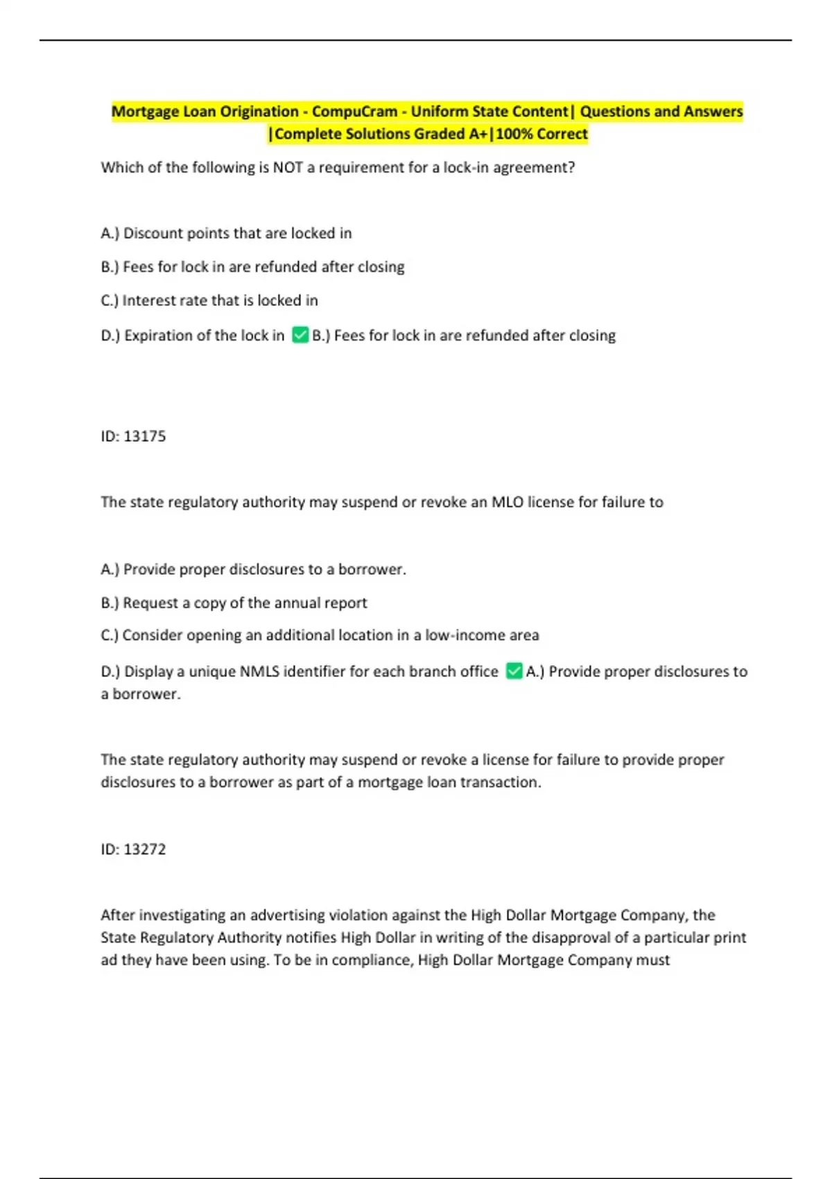 Mortgage Loan Origination - CompuCram - Uniform State Content| Questions and Answers |Complete Solutions Graded A+|100% Correct 2 Exam (elaborations) SAFE Mortgage Loan Originator Test - National Component with Uniform State Content| Questions and Answers |Complete Solutions Graded A+|100% Correct 3 Exam (elaborations) SAFE Mortgage Loan Originator