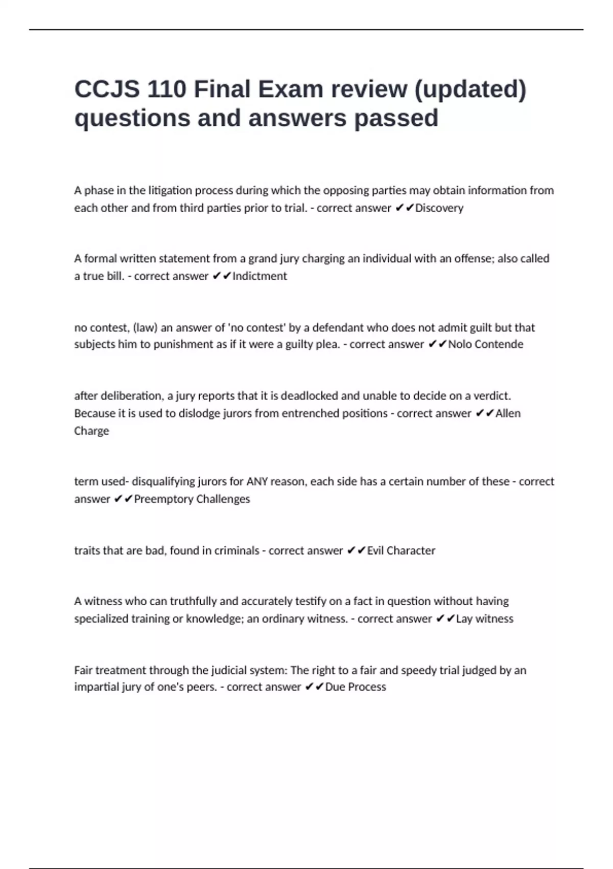 1 Exam (elaborations) CCJS 100 – Exam 1: Introduction to the Criminal Justice System 2 Exam (elaborations) CCJS 100 Exam 3 FINAL questions and answers graded A+ updated 3 Exam (elaborations) CCJS 100 UMD Exam 2 Madoo questions and answers already passed