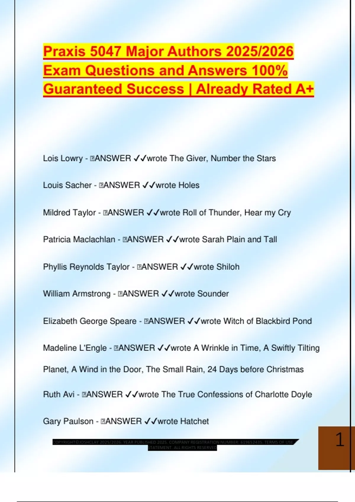 Praxis 5047 Major Authors 2025/2026 Exam Questions and Answers 100% Guaranteed Success | Already Rated A+
