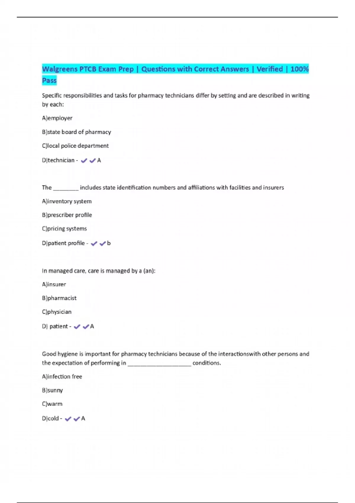 EXAMS BUNDLE PACKAGE:::::Walgreens PTCB | Questions with Correct Answers | 100% Pass