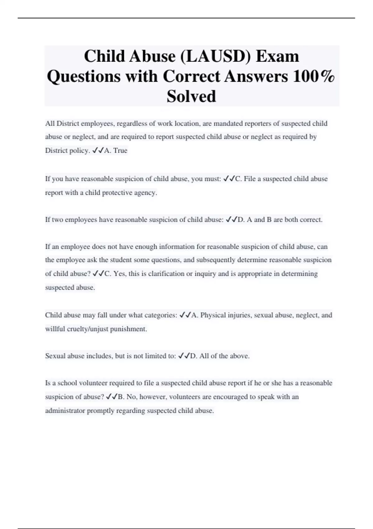 Child Abuse (LAUSD) Exam Questions with Correct Answers 100% Solved 2 Exam (elaborations) Child Abuse Exam Questions and Answers |Complete Solutions Graded A+ |100% Correct 3 Exam (elaborations) Child Abuse Exam Questions and Answers |Complete Solutions Graded A+ |100% Correct 4 Exam (elaborations) Child Abuse Exam Questions and Answers |Complete S