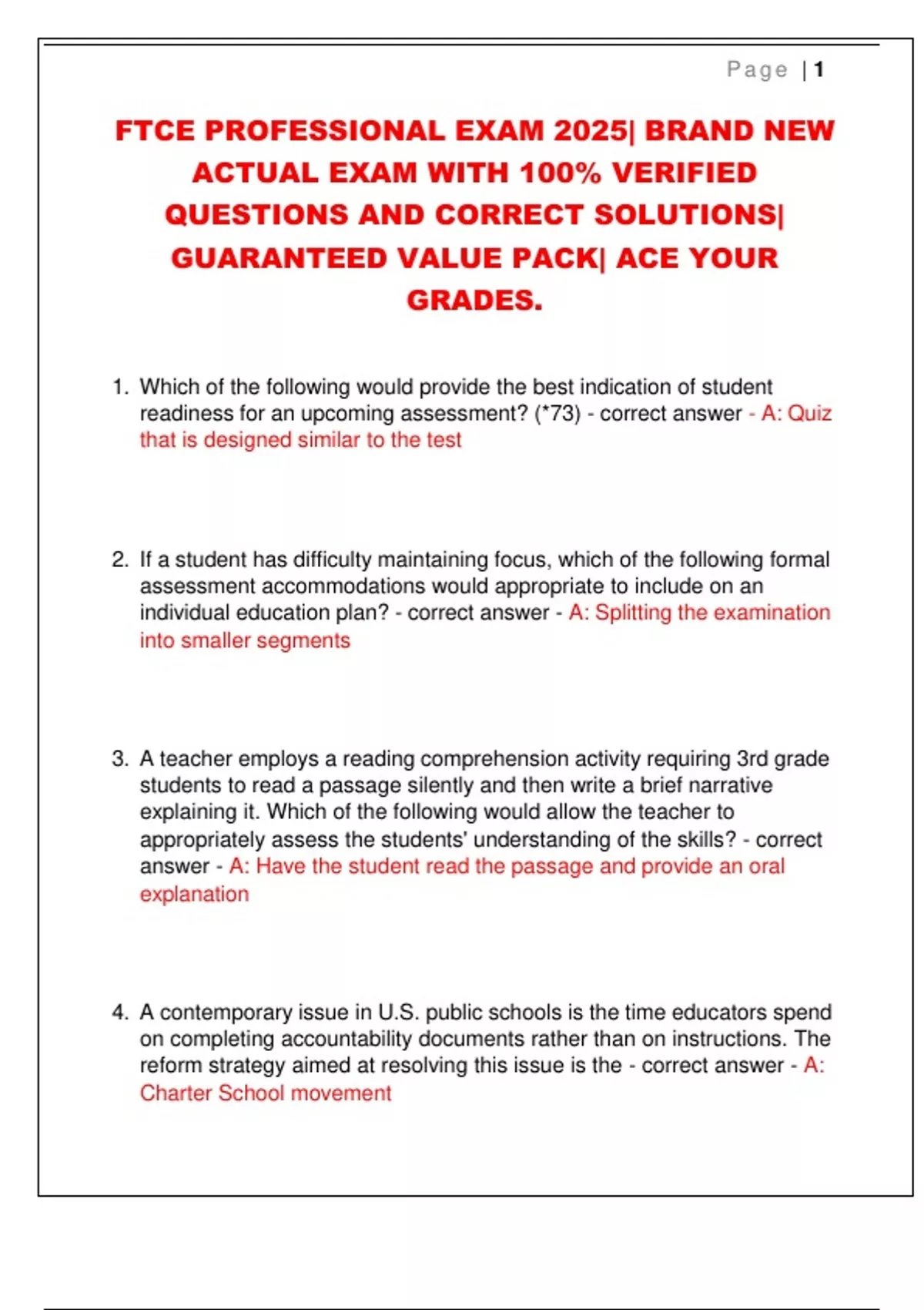 FTCE PROFESSIONAL EXAM 2025| BRAND NEW ACTUAL EXAM WITH 100% VERIFIED QUESTIONS AND CORRECT SOLUTIONS| GUARANTEED VALUE PACK| ACE YOUR GRADES.