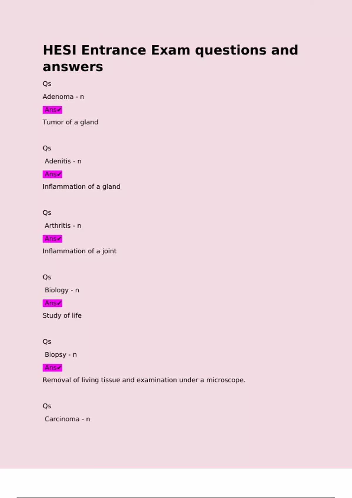 1 Exam (elaborations) HESI Entrance Exam 2024 questions and answers. Qs Sudden Example: The nurse noticed an abrupt change in the patient s level of pain - n Ans Abrupt , Qs To voluntarily refrain from something Example: The dental hygienist instructed the patient to 2 Exam (elaborations) HESI Entrance Exam questions and answers Qs Adenoma - n Ans