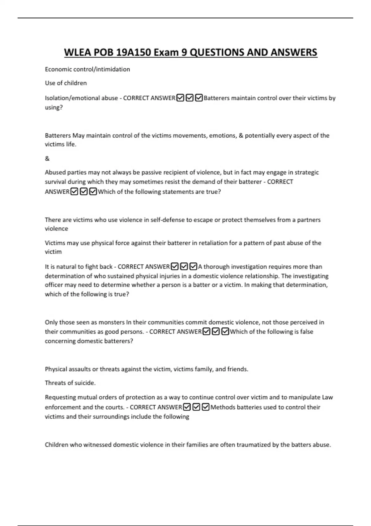 WLEA POB 19A150 Exam 9 QUESTIONS AND ANSWERS