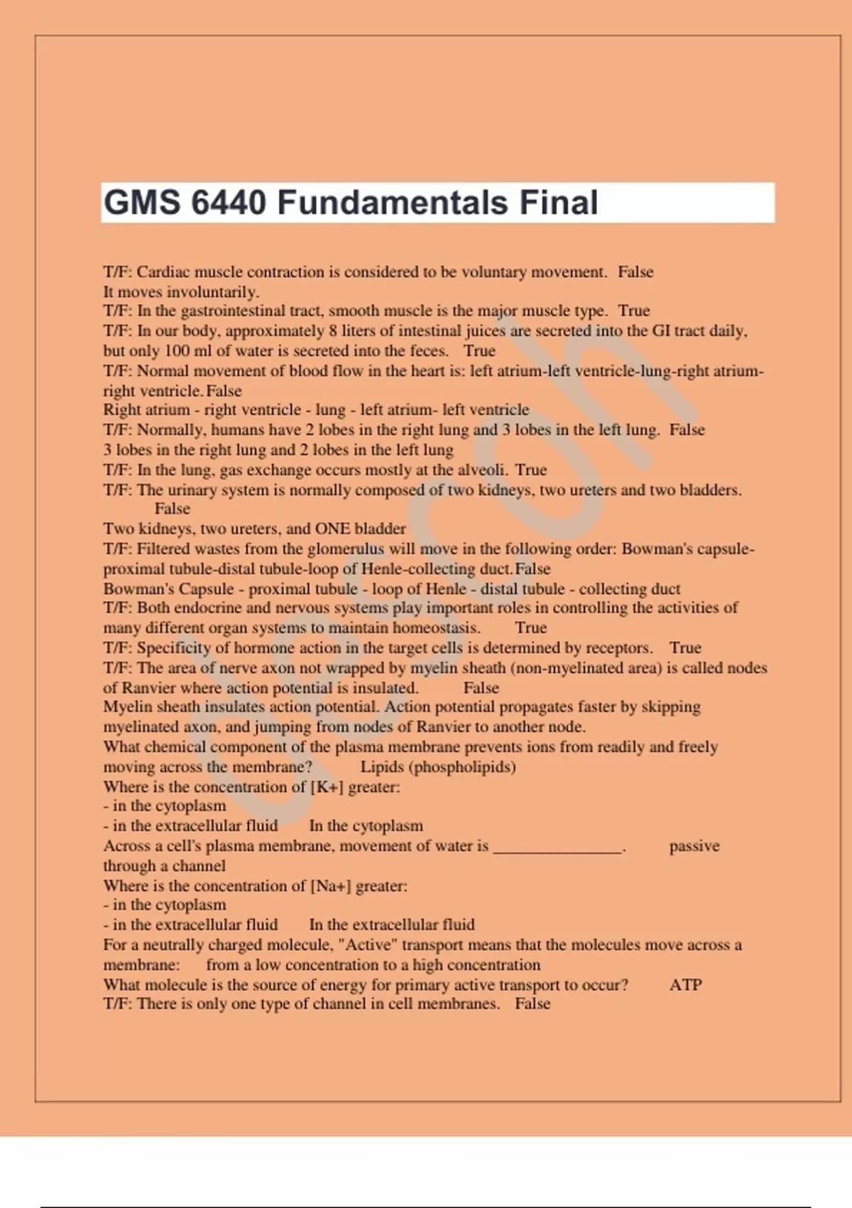 EXAM!!EXAM!!GMS 6440 Fundamentals Final WITH 100%PASSING RATE T/F: Cardiac muscle contraction is considered to be voluntary movement. False It moves involuntarily. T/F: In the gastrointestinal tract, smooth muscle is the major muscle type. True T/F: In our body, approximately 8 liters of intestinal juices are secreted into the GI tract d