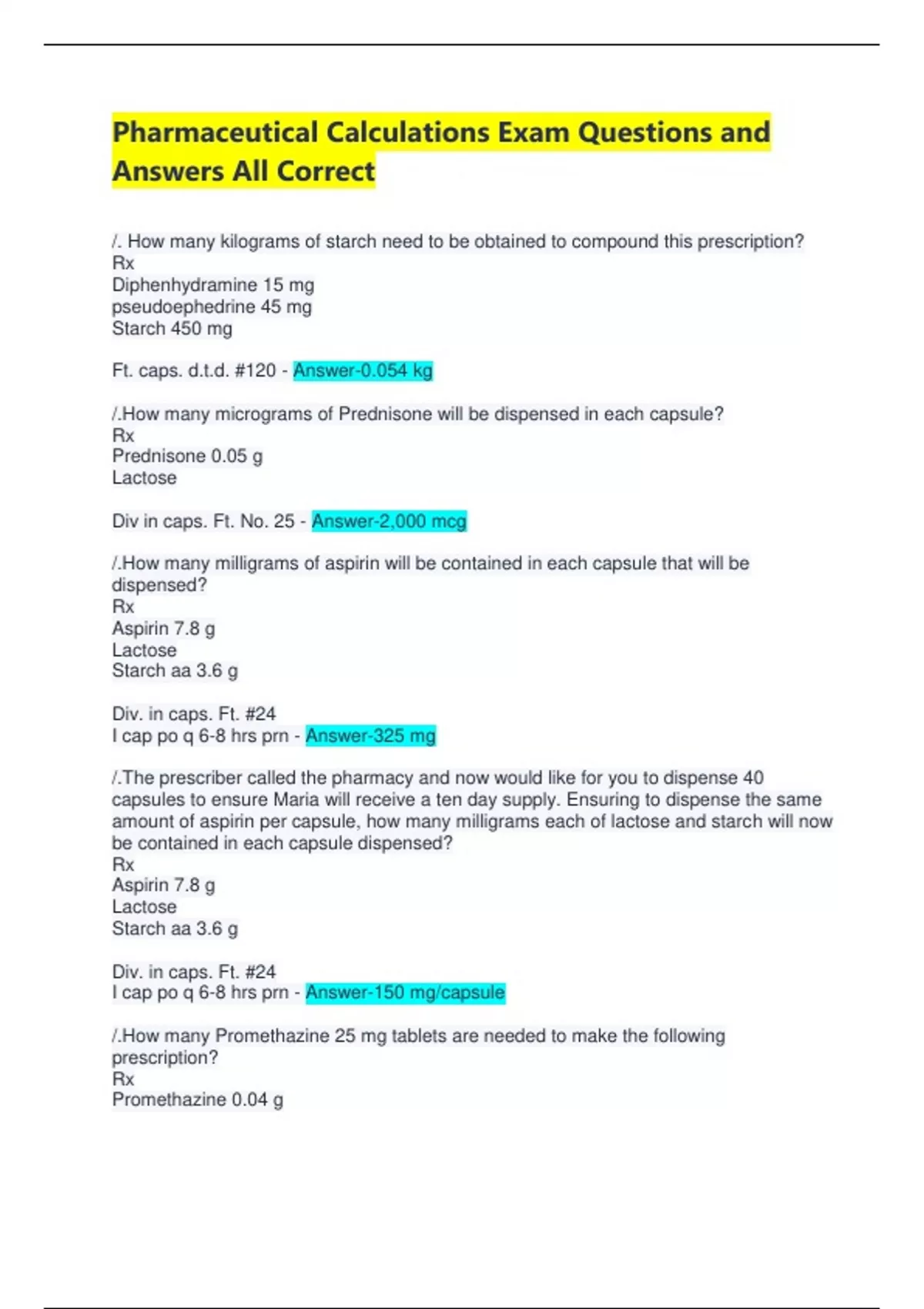 1 Exam (elaborations) Pharmaceutical Calculations Exam Questions and Answers All Correct 2 Exam (elaborations) Pharmaceutical Calculations Exam Questions And Answers 3 Exam (elaborations) PHARMACEUTICAL CALCULATIONS EXAM WITH 100% CORRECT ANSWERS 4 Exam (elaborations) Pharmaceutical Calculations Exam Questions With 100% Pass 5 Exam (elaboration