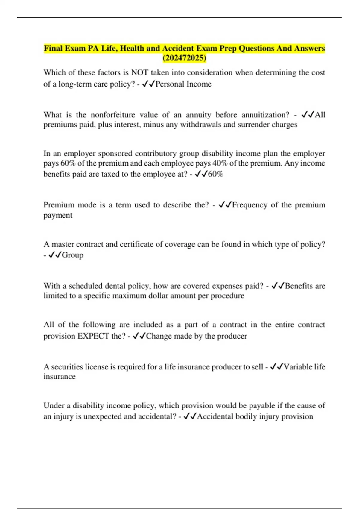 Final Exam PA Life, Health and Accident Exam Prep Questions And Answers ()