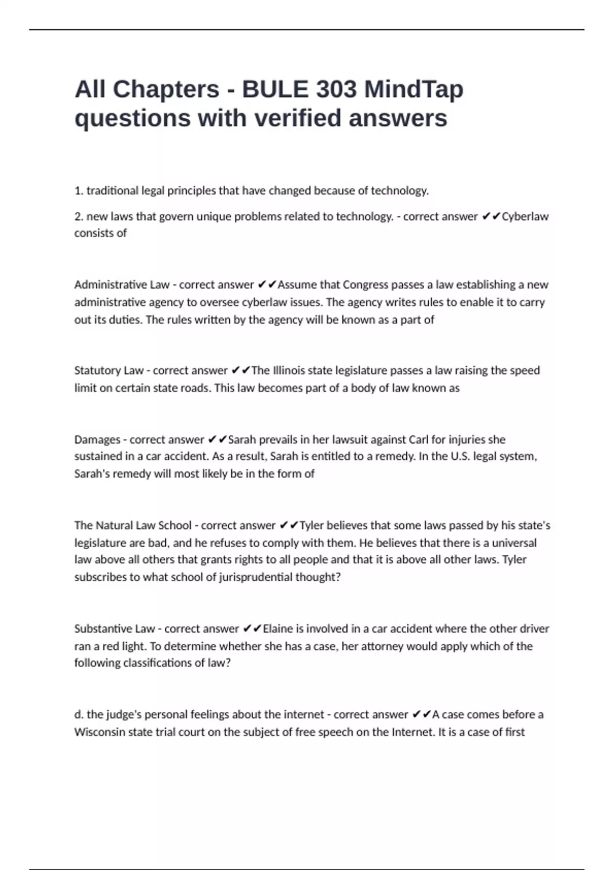Exam (elaborations) BULE 303-Chapter 20 Quiz with verified answers to pass 2 Exam (elaborations) Bule 303 test 2- hw questions with verified answers 3 Exam (elaborations) BULE 303 chpt 14, 15, 16 questions with verified answers already passed 4 Exam (elaborations) BULE 303 key terms quiz (all parts) well answered to pass 5 Exam (elaborations)