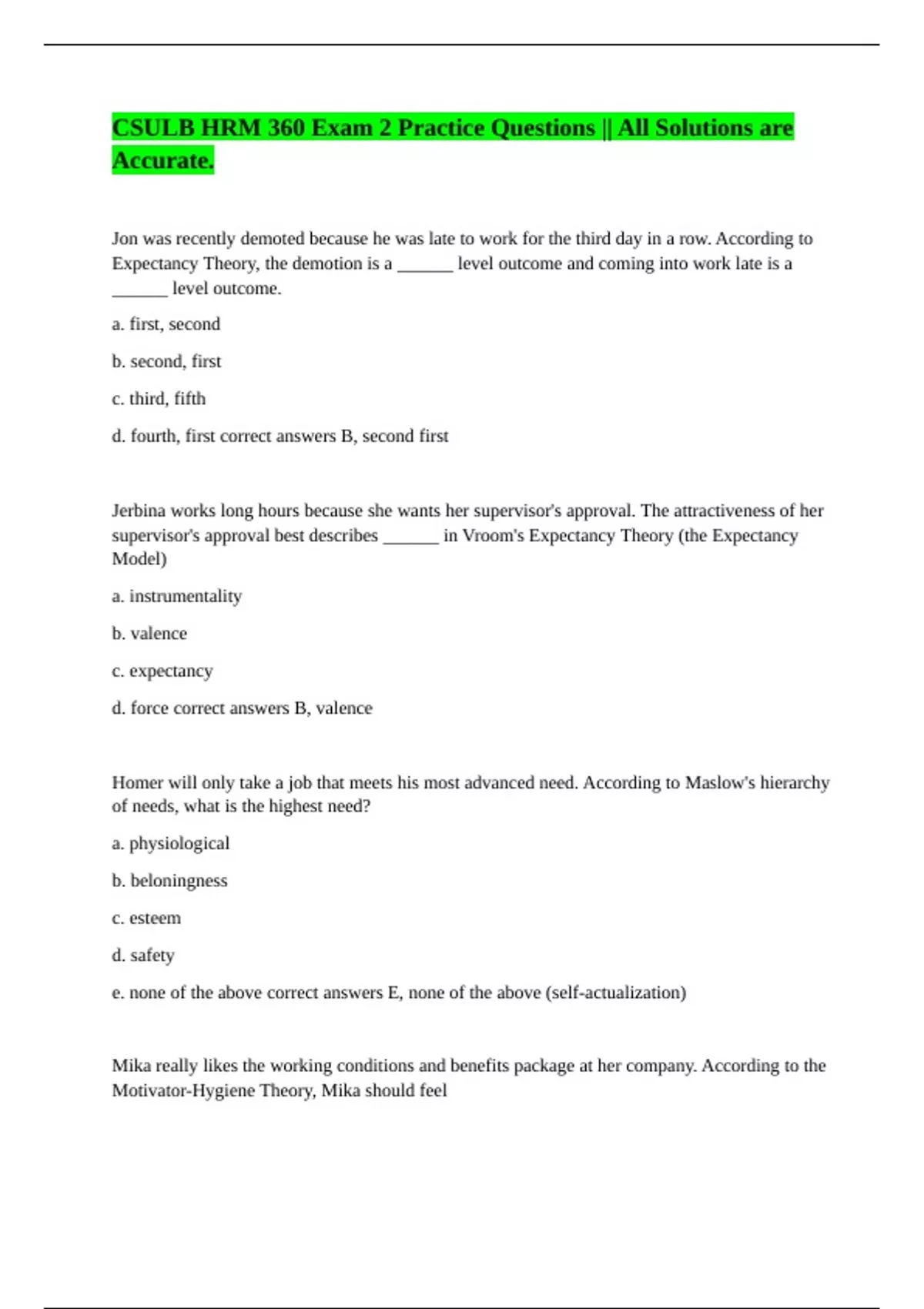 CSULB HRM 360 Exam 2 || Top Grade Assured. UTK HRM 360 Exam One Review (Mackey) || with Errorless Answers. UTK HRM 360 Exam 2 || Zero Flaw on Answers. HRM 360: 8-5 Part 2 || All Answers are Valid. HRM 360: Final Exam || Answered Perfectly 100%. HRM 360: Exam 2 Sample Questions || A+ Score Secured. HRM 360- EXAM 2 UTK || 100% Correct Answers. HRM 36