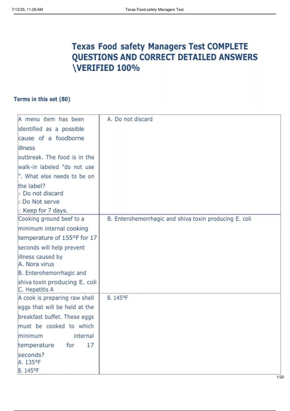 Exam (elaborations) TEXAS FOOD SAFETY MANAGER UPDATED QUESTIONS AND CORRECT DETAILED ANSWERS VERIFIED 100% ALREADY GRADED A+ Exam (elaborations) TEXAS FOOD SAFETY MANAGER UPDATED QUESTIONS AND CORRECT DETAILED ANSWERS VERIFIED 100% ALREADY GRADED A+
