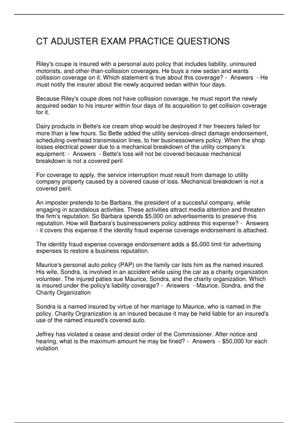 CT ALL LINES ADJUSTER EXAM QUESTIONS 2 CT ALL LINES ADJUSTER EXAM 3 CT ADJUSTER PRE-LICENSING CHAPTER 1 THRU 7 4 CT ADJUSTER EXAM PRACTICE QUESTIONS 5 CT ADJUSTER EXAM - BASIC TERMS AND UNDERSTANDINGS 6 CT ADJUSTER 12-CT LAW QUESTIONS & ANSWERS 7 CONNECTICUT CASUALTY ADJUSTER FOR ALL LINES - DAYS, NUMBERS, AND LIMITS 2025
