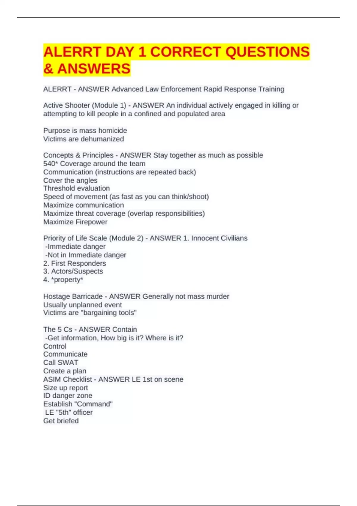 ALERRT LEVEL 1 ACTIVE SHOOTER COURSE CORRECT 100% COMPLETE EXAM BUNDLE