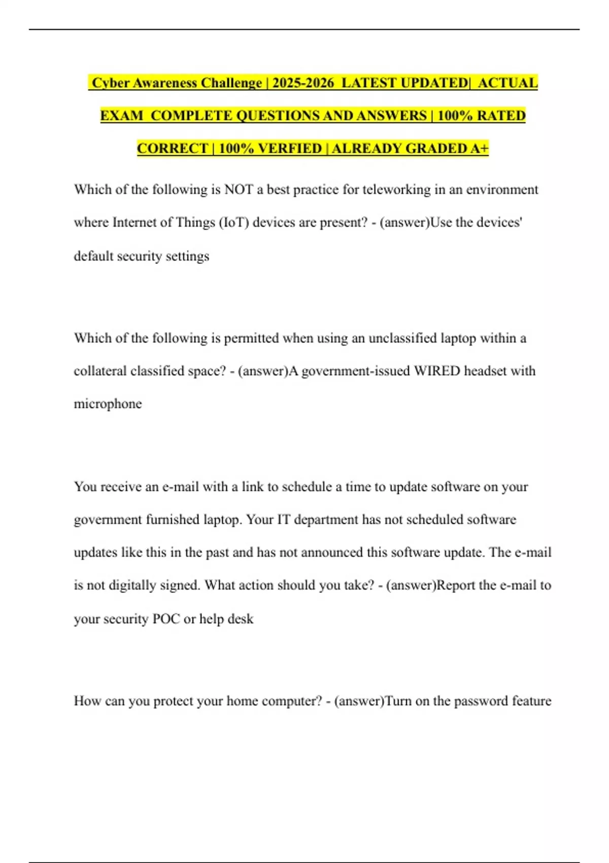 PACKAGE DEAL FOR Cyber Awareness Challenge | LATEST UPDATED| ACTUAL EXAM COMPLETE QUESTIONS AND ANSWERS | 100% RATED CORRECT | 100% VERFIED | ALREADY GRADED A | 2 COPIES