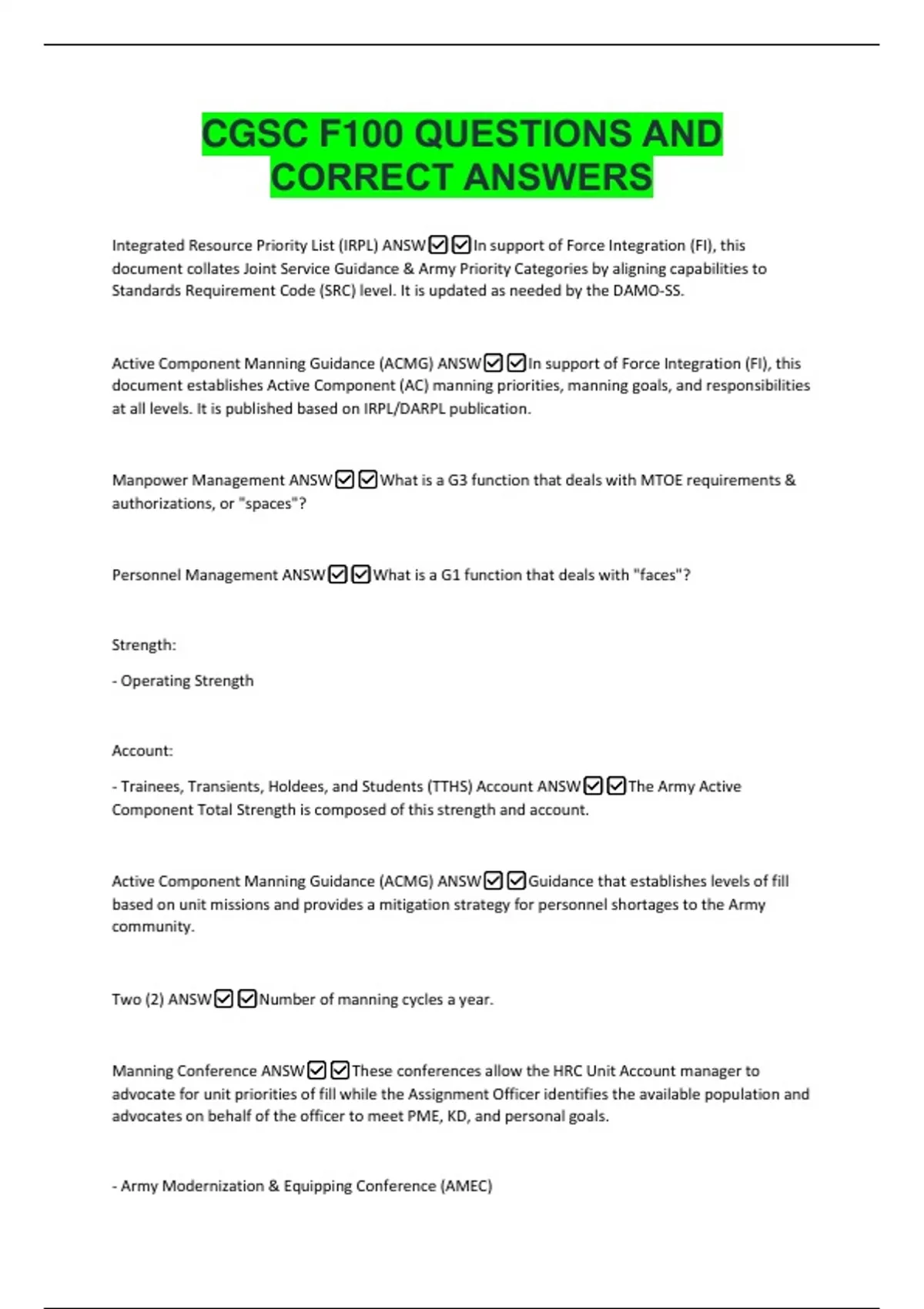 PACKAGE..CGSC F100 BUNDLE EXAMS WITH COMPLETE ANSWERS