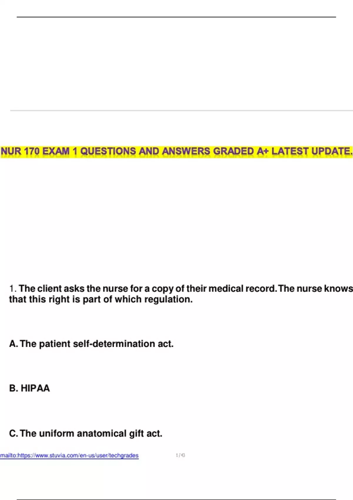 NURSING SCHOOL IS HARD AM HERE TO SIMPLIFY THE INFORMATION AND MAKE IT EASIER!! My mission is to be your light in the dark, if you are worried or having trouble in nursing school, i really want my notes to be your guide, stay with me and you will find everything you need to study and pass any tests, quizzes and exams! Assisting students with quality work is my first priority. I know how frustrating it can get with all those assignments mate! I have essential guides that are A graded. Get verified solutions from LECTSADH.
