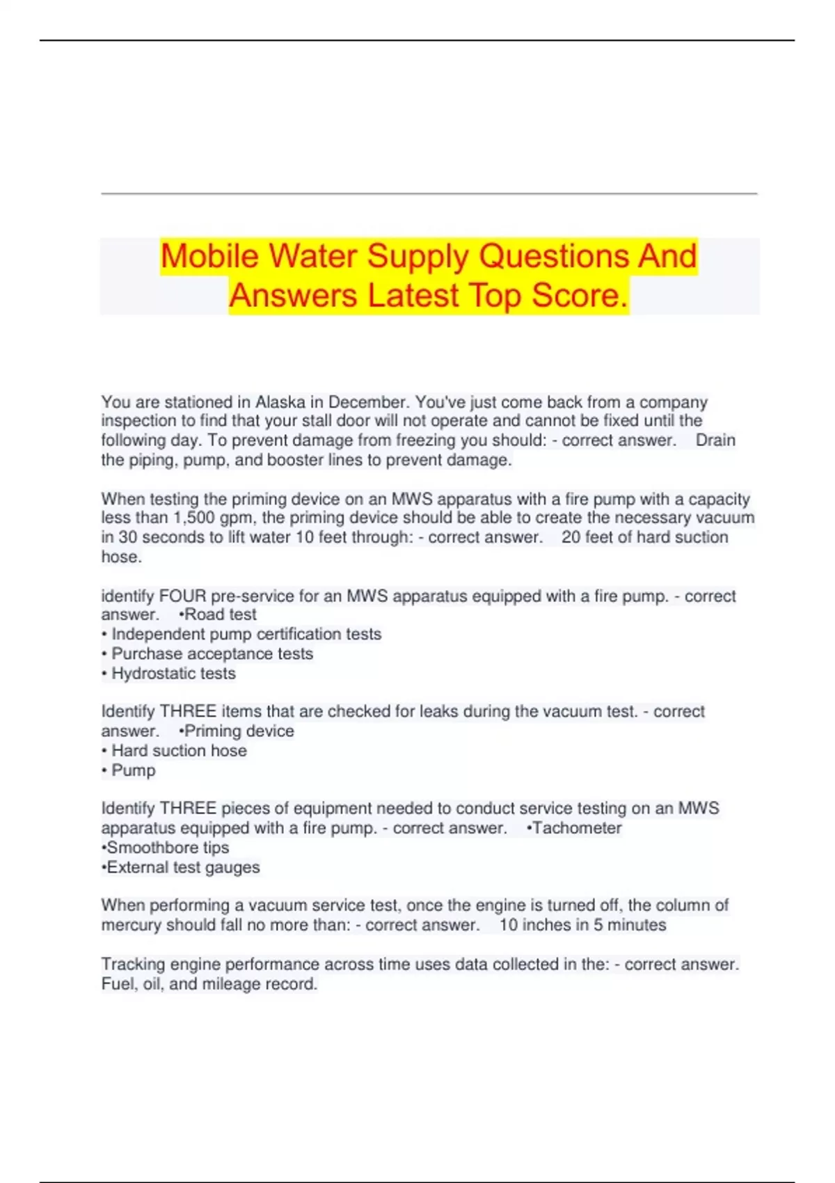 MOBILE WATER SUPPLY EXAM QUESTIONS AND ANSWERS GRADED A+ LATEST UPDATE. Driver Operator Mobile Water Supply Questions And Answers 100% Verified. DRIVER OPERATOR MOBILE WATER SUPPLY EXAM QUESTIONS AND ANSWERS GRADED A+ 100% VERIFIED.