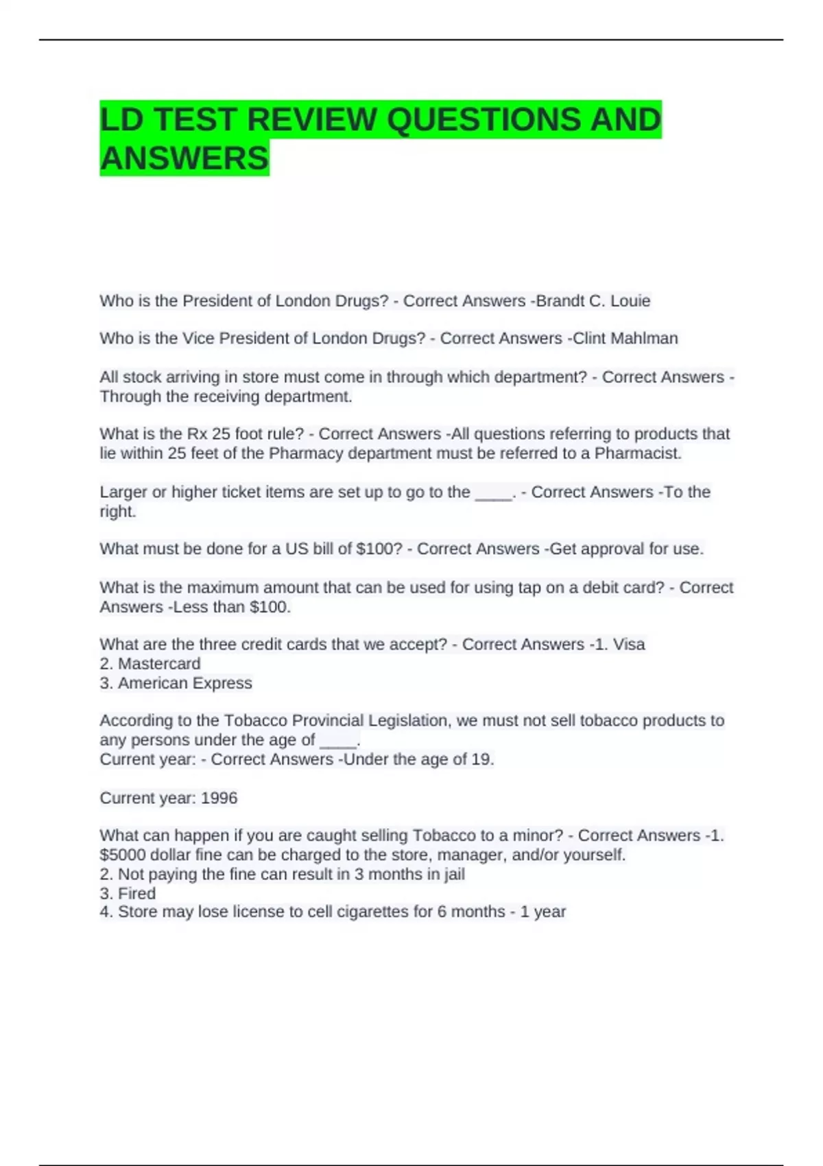 1 Exam (elaborations) LONDON DRUGS TRAINING EXAM QUESTIONS AND ANSWERS 2 Exam (elaborations) LONDON DRUGS TERMINAL QUIZ QUESTIONS WITH CORRRECT ANSWERS 3 Exam (elaborations) LONDON DRUGS QUIZ WITH COMPLETE SOLUTIONS (GRADED A) 4 Exam (elaborations) LONDON DRUGS ORIENTATION AND TRAINING EXAM QUESTIONS AND ANSWERS 5 Exam (elaborations) LONDON DRU