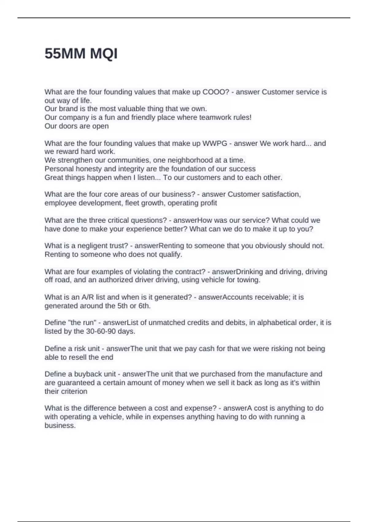 MQI. Area Manager Questions and Answers 100% Solved
