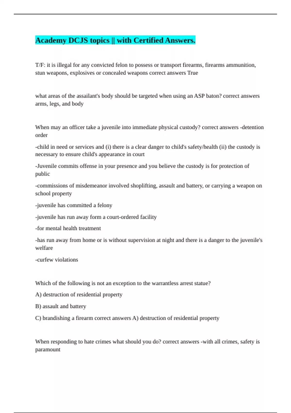 DCJS unarmed || 100% Verified Answers. Academy DCJS topics || with Certified Answers. DCJS Exam || Graded A+. DCJS EXAM || Possible Questions Accurately Answered. DCJS Exam || 100% Correct Answers. DCJS Final Test Study Guide || All Solutions are Accurate. DCJS CCJTA Exam 1 - CJ System, History, policing ethics, career development, lifestyle || Sol
