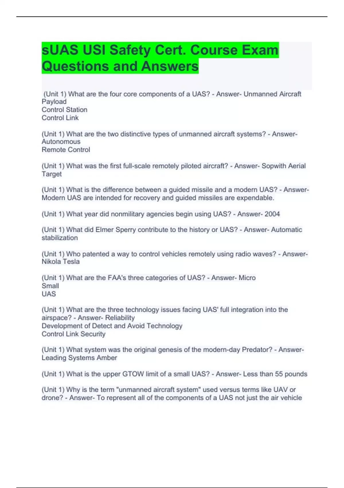 1 Exam (elaborations) sUAS USI Safety Cert. Course Exam Questions and Answers 2 Exam (elaborations) sUAS Safety Certification Practice Exam 2023 3 Exam (elaborations) SUA_BACKUP EXAM QUESTIONS AND ANSWERS 4 Exam (elaborations) SUA TEST REVIEW QUESTIONS AND ANSWERS | UPDATED | GRADED A 5 Exam (elaborations) SUA TEST QUESTIONS WITH CORRECT ANSWER