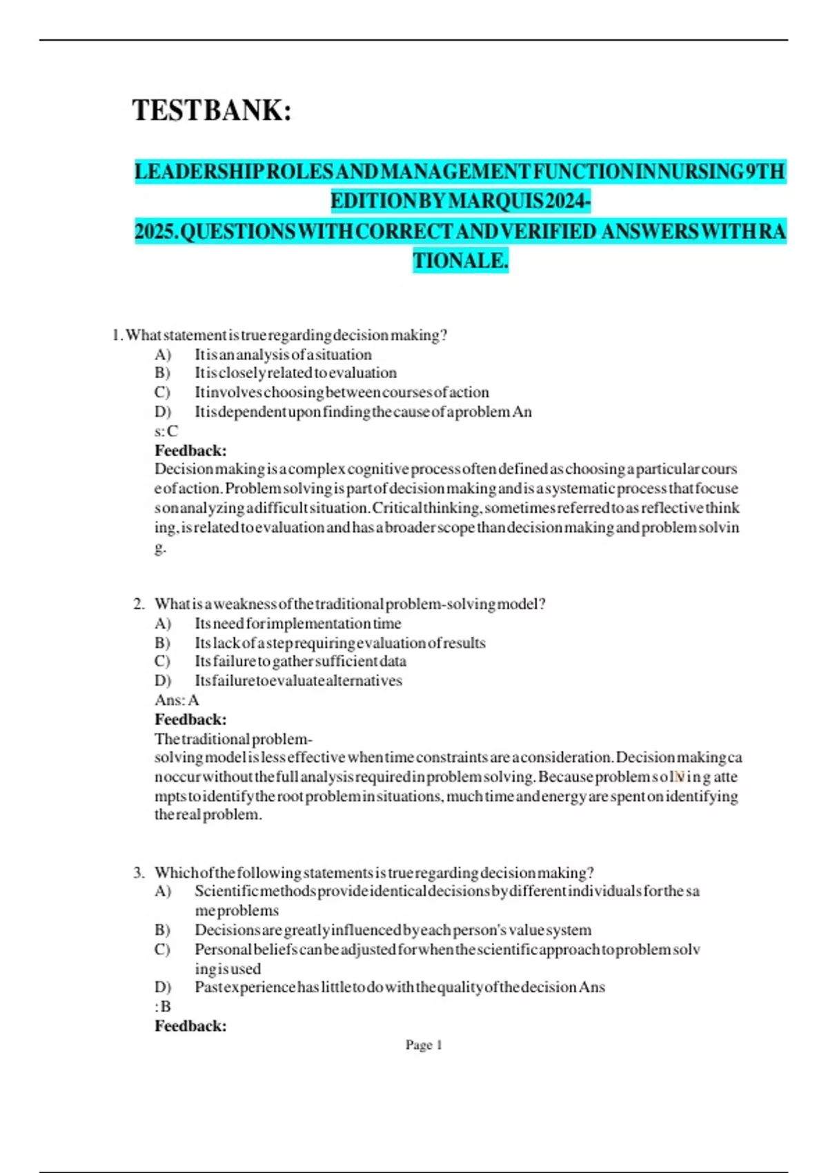 test bank For leadership roles and management functions in nursing theory and application 11th edition huston Latest Update!!! (3)