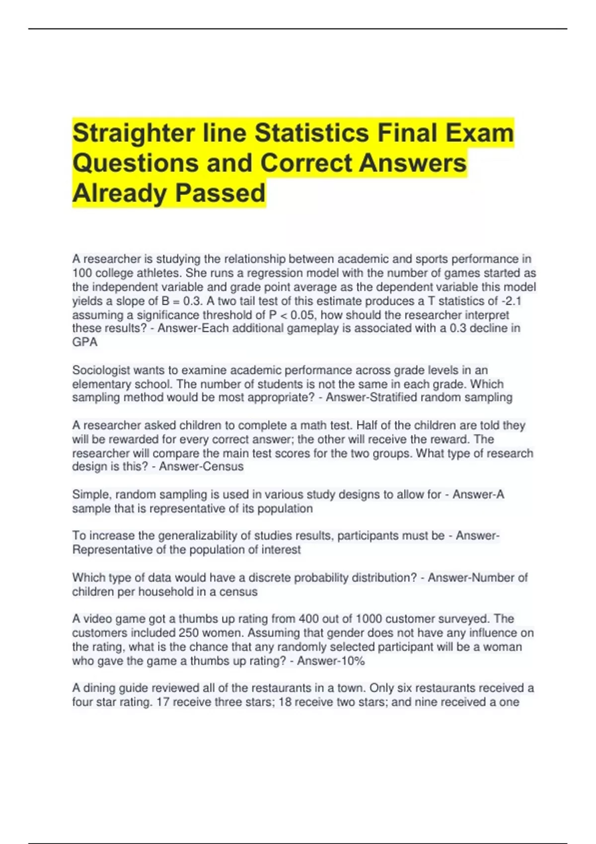 Straighter line Nutrition 101 Final Exam Questions and Answers All correct 2 Exam (elaborations) Straighter line Nutrition 101 2021 Final Exam Questions and Correct Answers Already Passed 3 Exam (elaborations) Straighter line Statistics Final Exam Questions and Correct Answers Already Passed 4 Exam (elaborations) STRAIGHTERLINE Introduction to N
