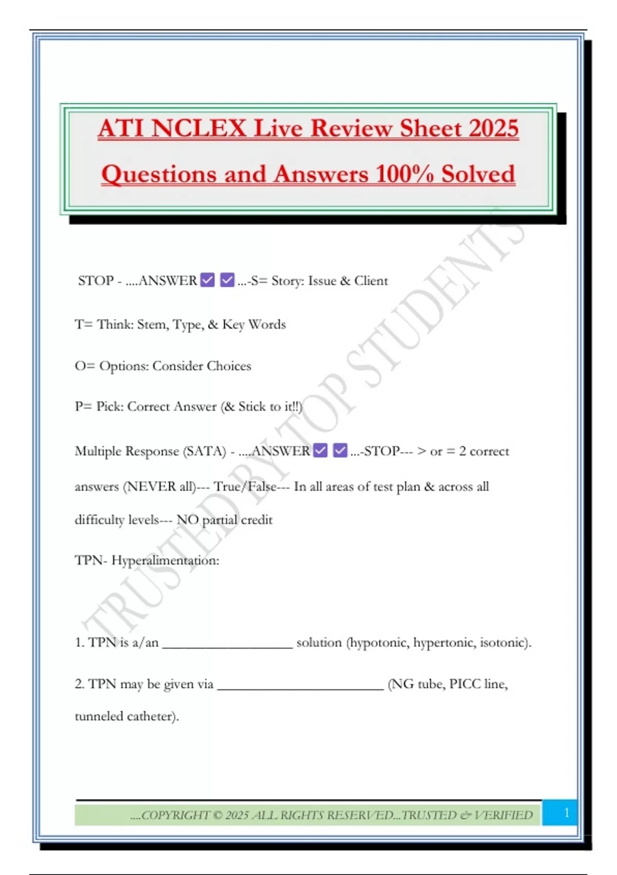 ATI NCLEX Live Review Sheet 2025 Questions and Answers 100% Solved