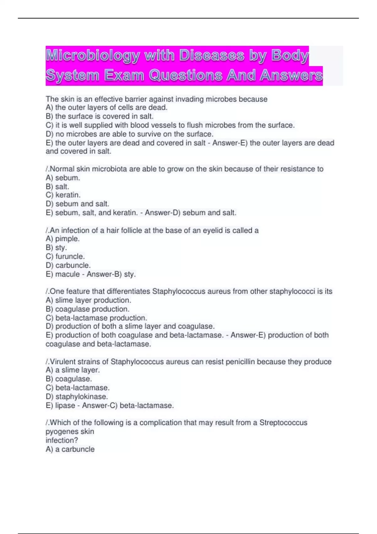 1 Exam (elaborations) Test Bank For Microbiology test review OPENSTAX Exam Questions And Answers 2 Exam (elaborations) An Introduction to Microbiology Exam Questions And Answers 3 Exam (elaborations) BIO 230 MICROBIOLOGY - EXAM QUESTIONS WITH CORRECT ANSWERS 4 Exam (elaborations) Exam 4 Microbiology 119 Moraine Valley Community College Dr. Halm