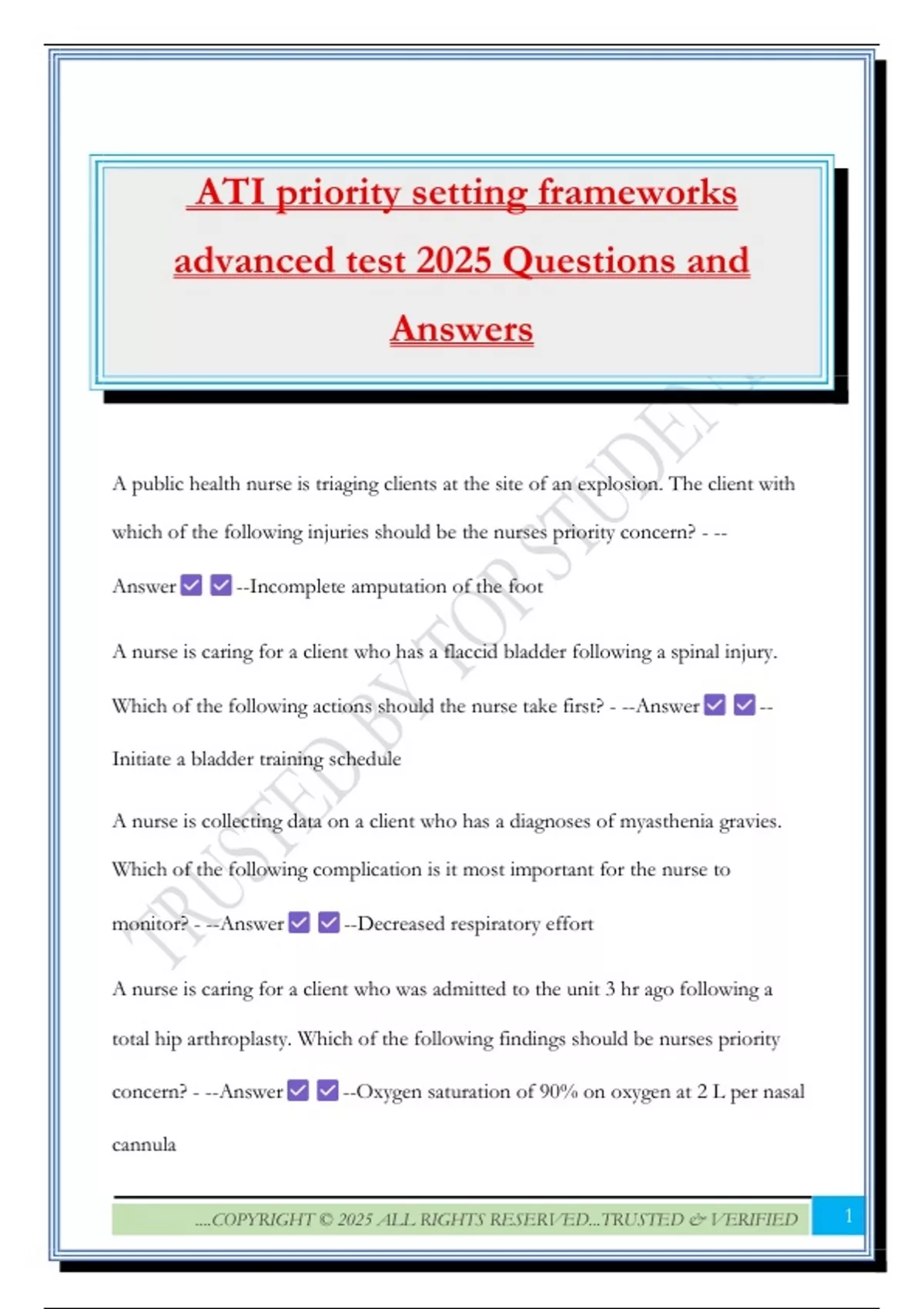 ATI Nurse Logic 2.0 ~ Priority Setting Frameworks (Advanced Test) 2025 Questions and Answers