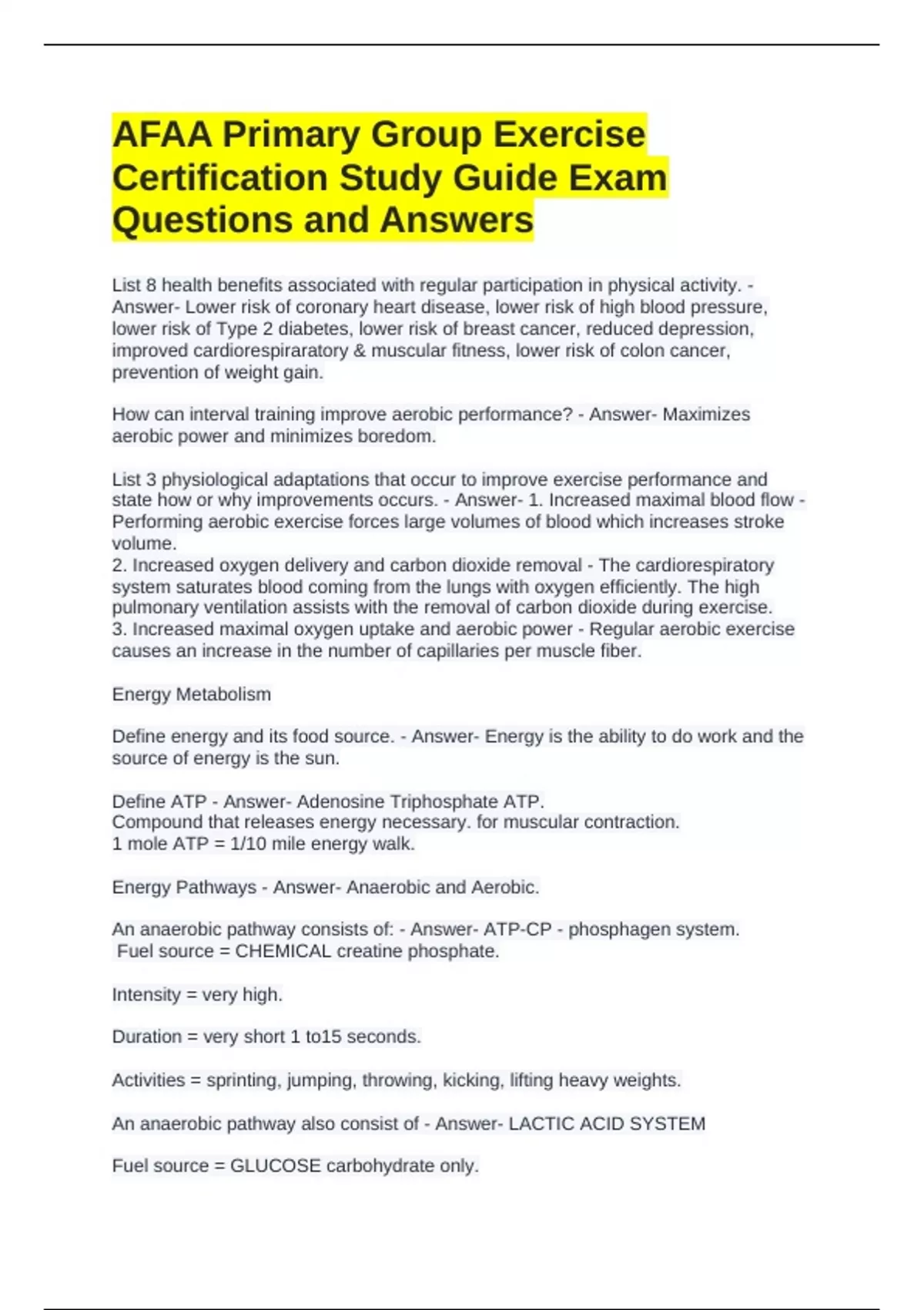 AFAA Primary Group Exercise Certification Study Guide Exam Questions and Answers