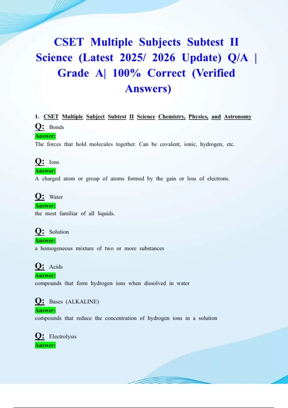 CSET Multiple Subjects Subtest II Science (Latest 2025/ 2026 Update) Q/A | Grade A| 100% Correct (Verified Answers)