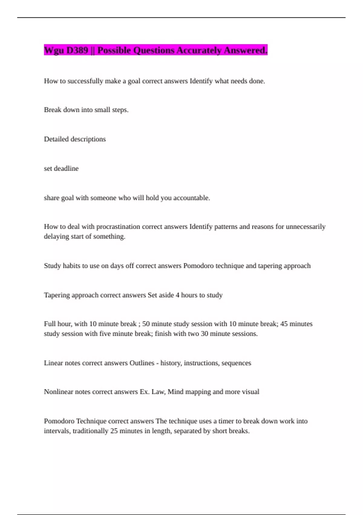 Wgu D389 || Possible Questions Accurately Answered. D389 Lesson 1-4 Quiz Questions & Section 1 Test Questions || with Complete Solution. D389 || All Solved. D389 Learning Strategies in High Education || 100% Accurate Answers. D389 Learning Strategies in Higher Education || 100% Verified Answers.