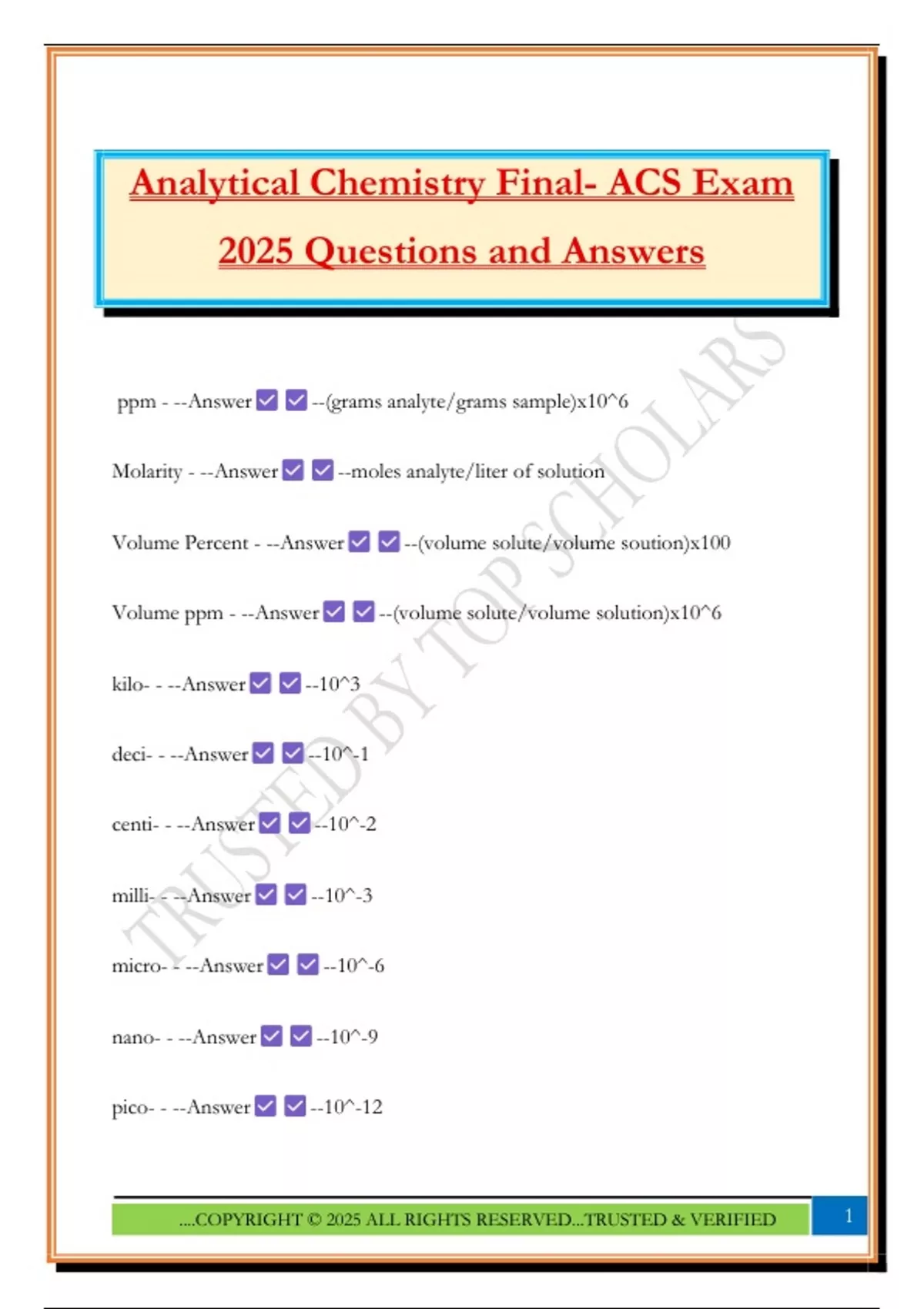 Analytical Chemistry Bundled Exams 2025 |Questions with Correct Answers |100% Satisfaction Guaranteed