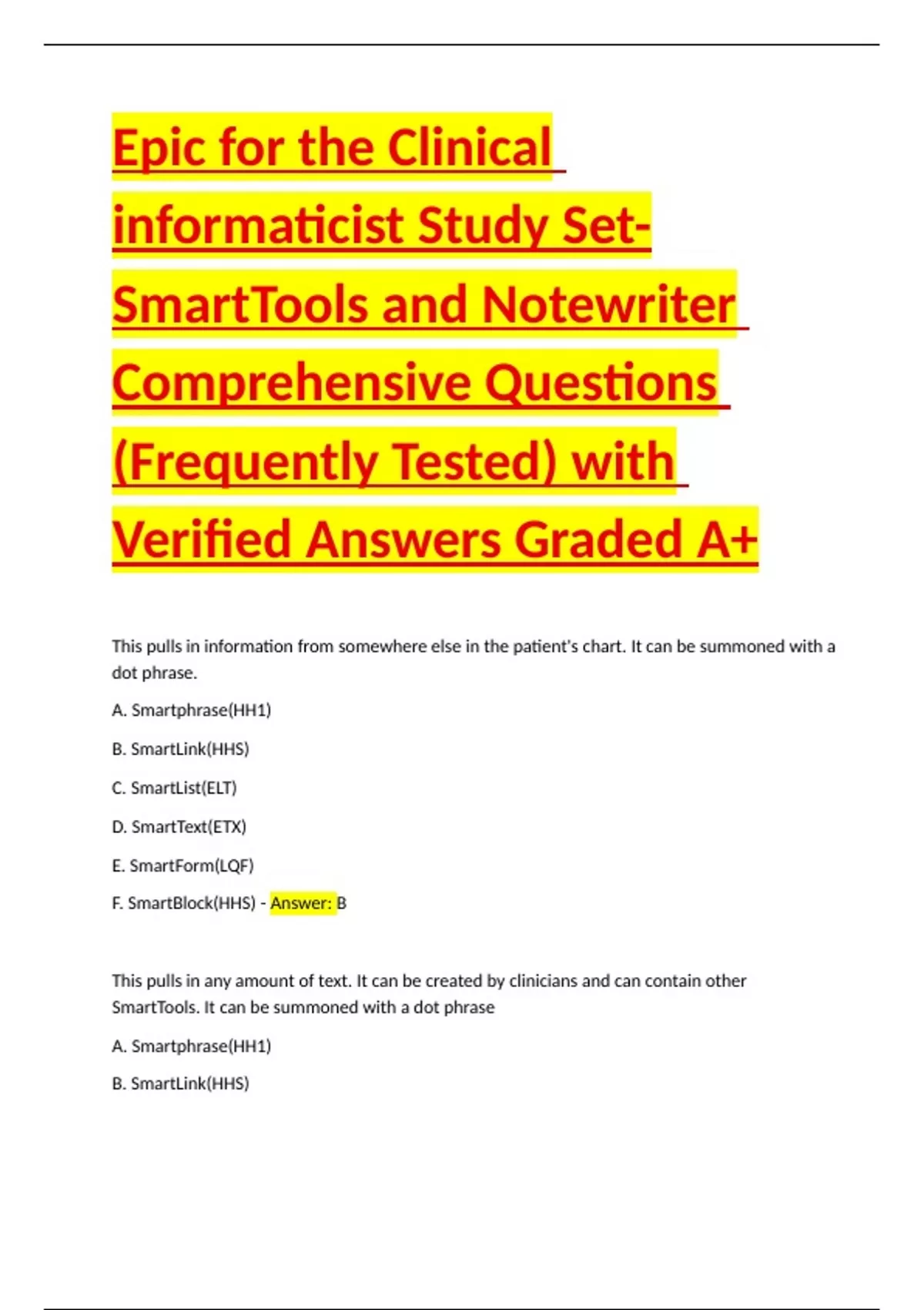 Epic Clinical Informaticist - Epic Certification Comprehensive Questions (Frequently Tested) with Verified Answers Graded A Package Deal