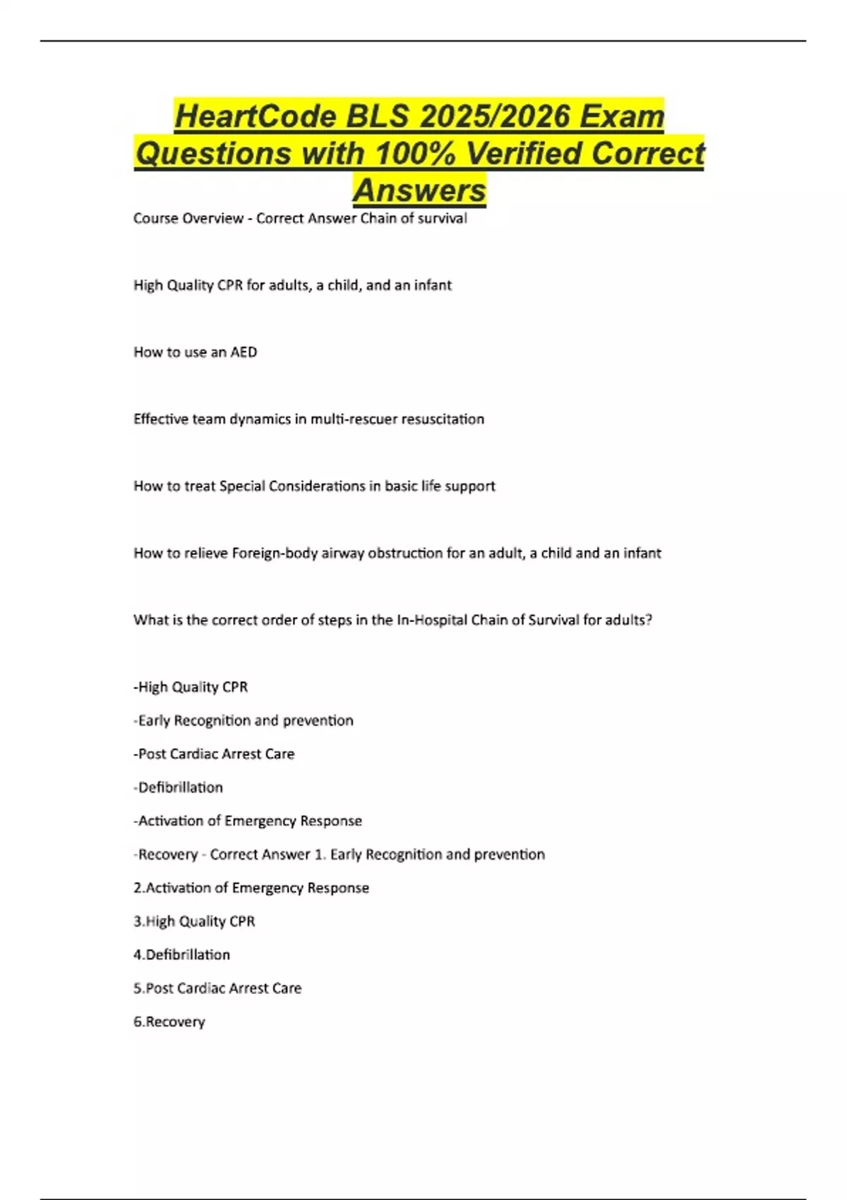 Heartcode BLS CPR Online Course Review Questions with Correct Answers