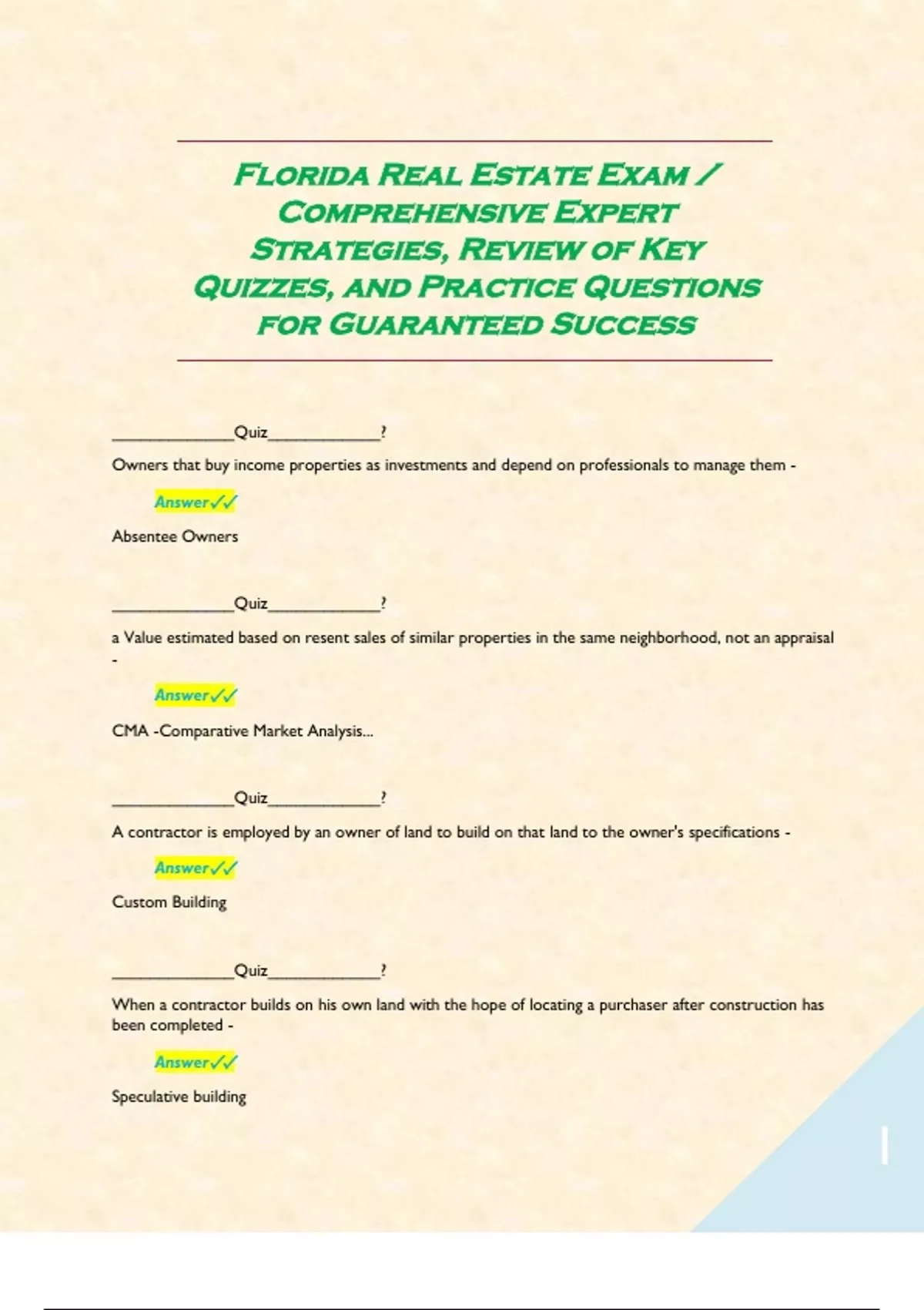 1 Exam (elaborations) Florida DMV Learner s Permit Test / Review Questions & Certified Solutions / 100% Correct / Already Graded A+. 2 Exam (elaborations) Florida Class E Driver License study guide / Expert Verified Actual Questions & Answers for Guaranteed Pass | Newest Update, .