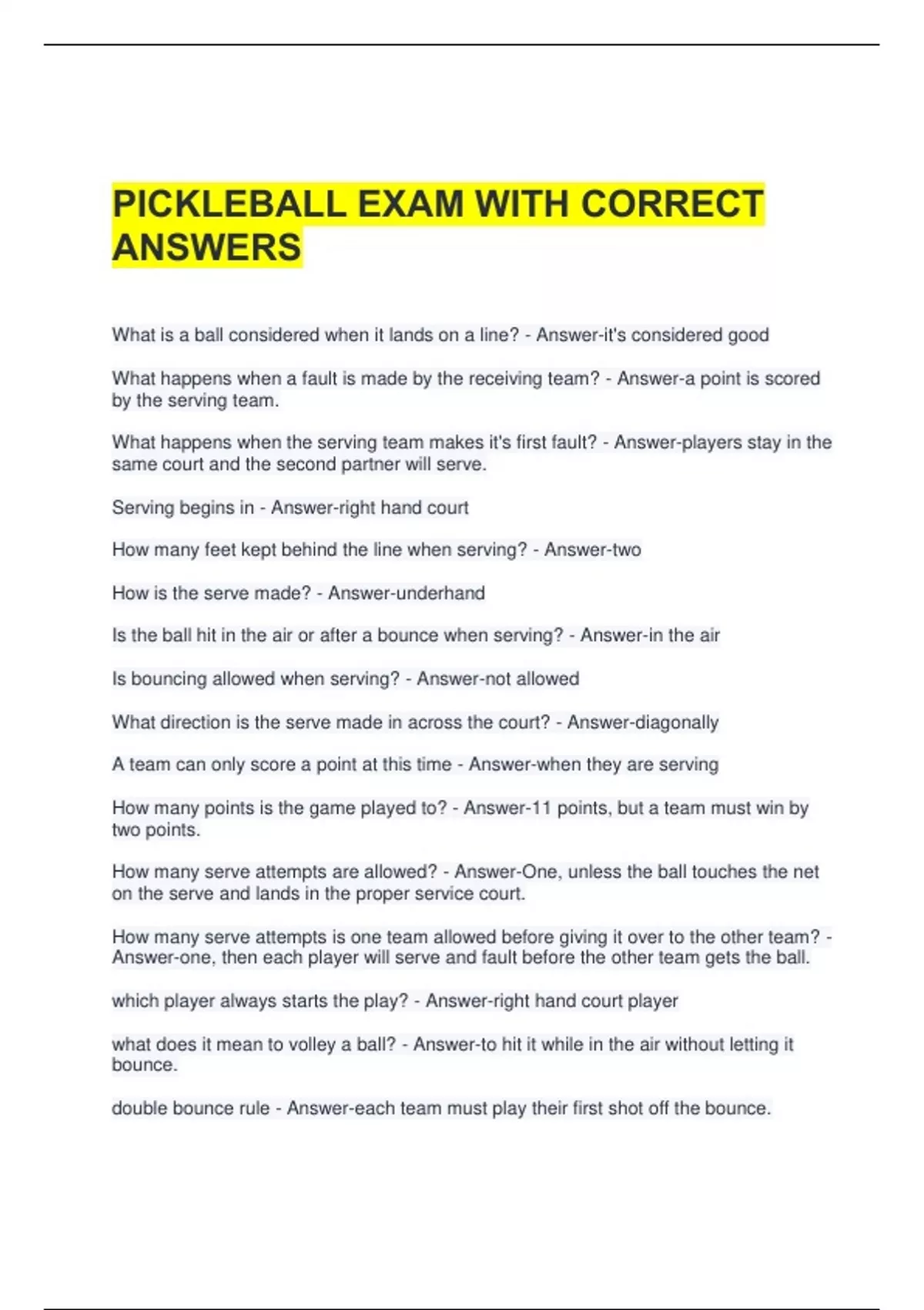 BUNDLE FOR PICKLEBALL EXAM QUESTIONS AND CORRECT ANSWERS ALREADY PASSED