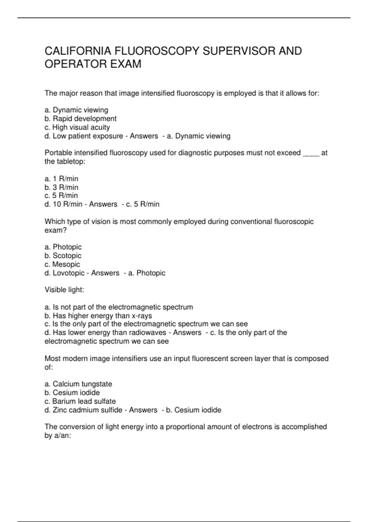 CALIFORNIA FLUOROSCOPY SUPERVISOR AND OPERATOR EXAM/CALIFORNIA FLUOROSCOPY TEST QUESTIONS & ANSWERS/CALIFORNIA FLUOROSCOPY STATE BOARD EXAM/FLUOROSCOPY EXAM QUESTIONS & ANSWERS