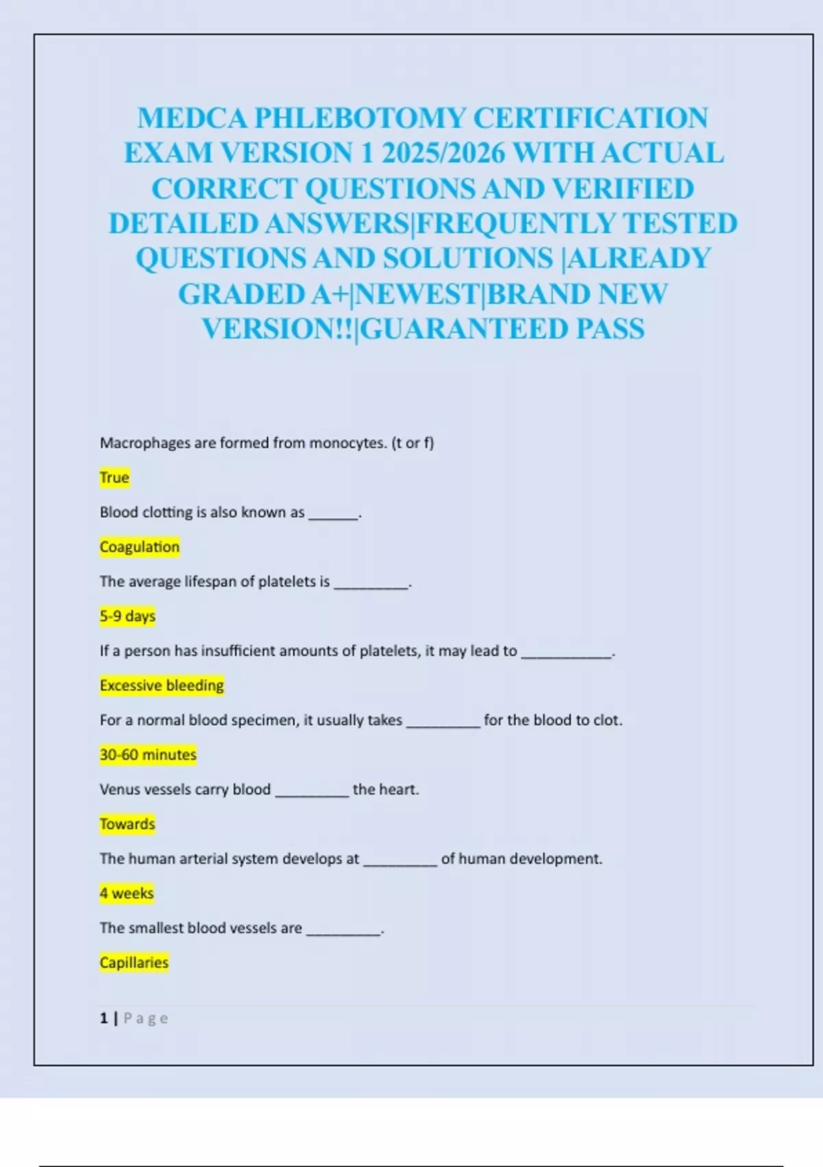 MEDCA PHLEBOTOMY CERTIFICATION EXAM 2025/2026 WITH ACTUAL CORRECT QUESTIONS AND VERIFIED DETAILED ANSWERS|FREQUENTLY TESTED QUESTIONS AND SOLUTIONS |ALREADY GRADED A+|NEWEST|BRAND NEW VERSION!!|GUARANTEED PASS