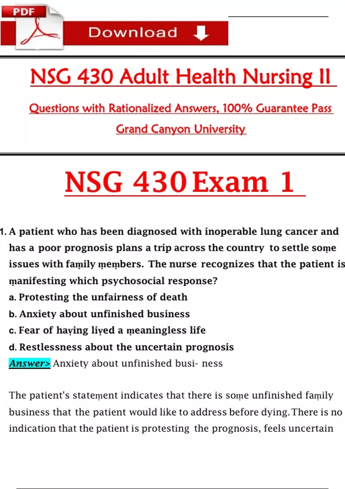 NSG 430 Exam 1, 2, & 3 Adult Health Nursing II Tested Questions (Latest 2025 / 2026) and Verified Rationalized Answers, (A+ Guarantee) - Grand Canyon University