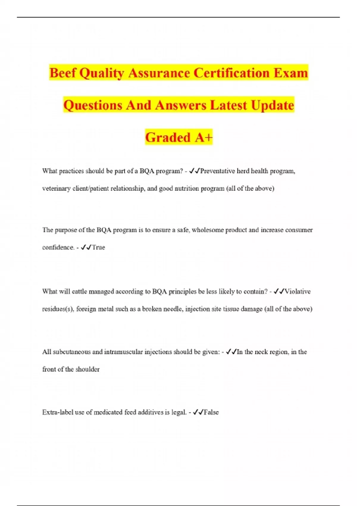 Beef Quality Assurance Certification Exam Questions And Answers Latest Update Graded A+