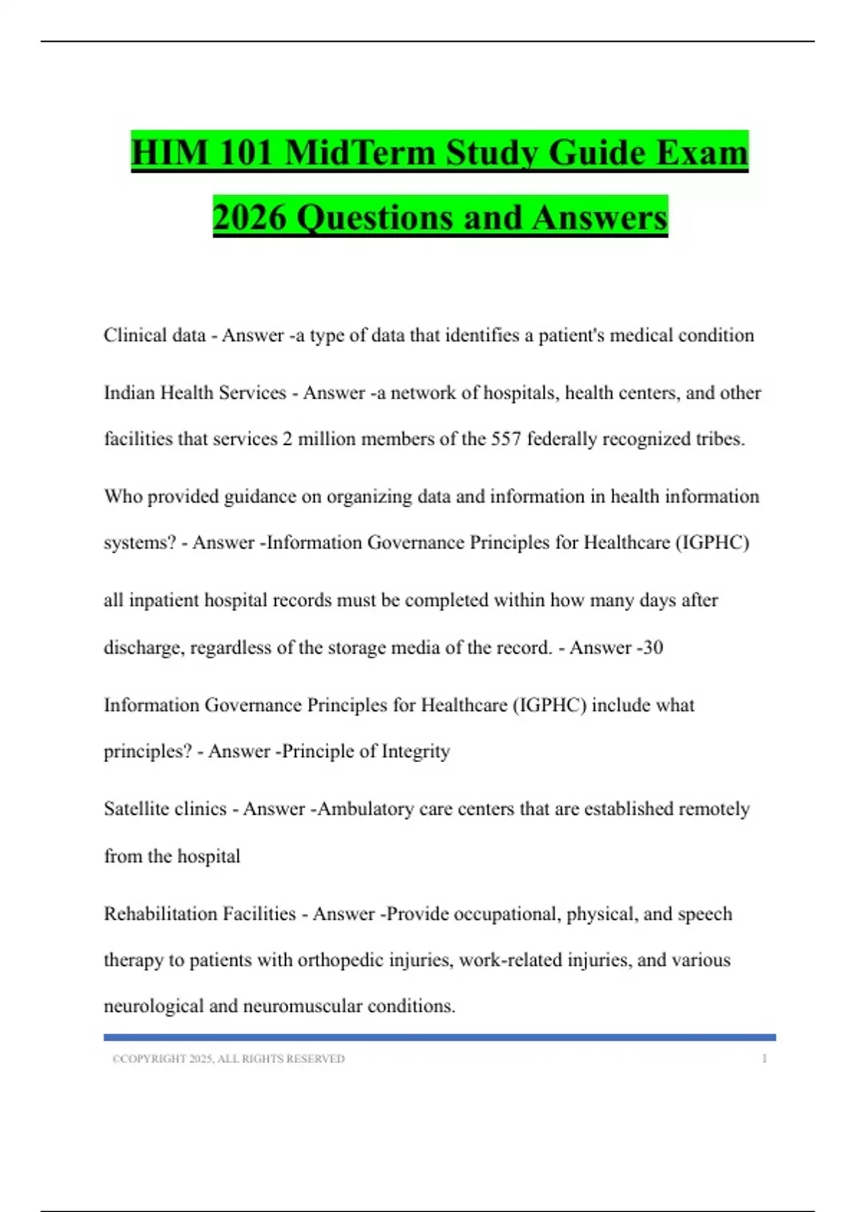 HIM 101 MidTerm Study Guide Exam 2026 Questions and Answers