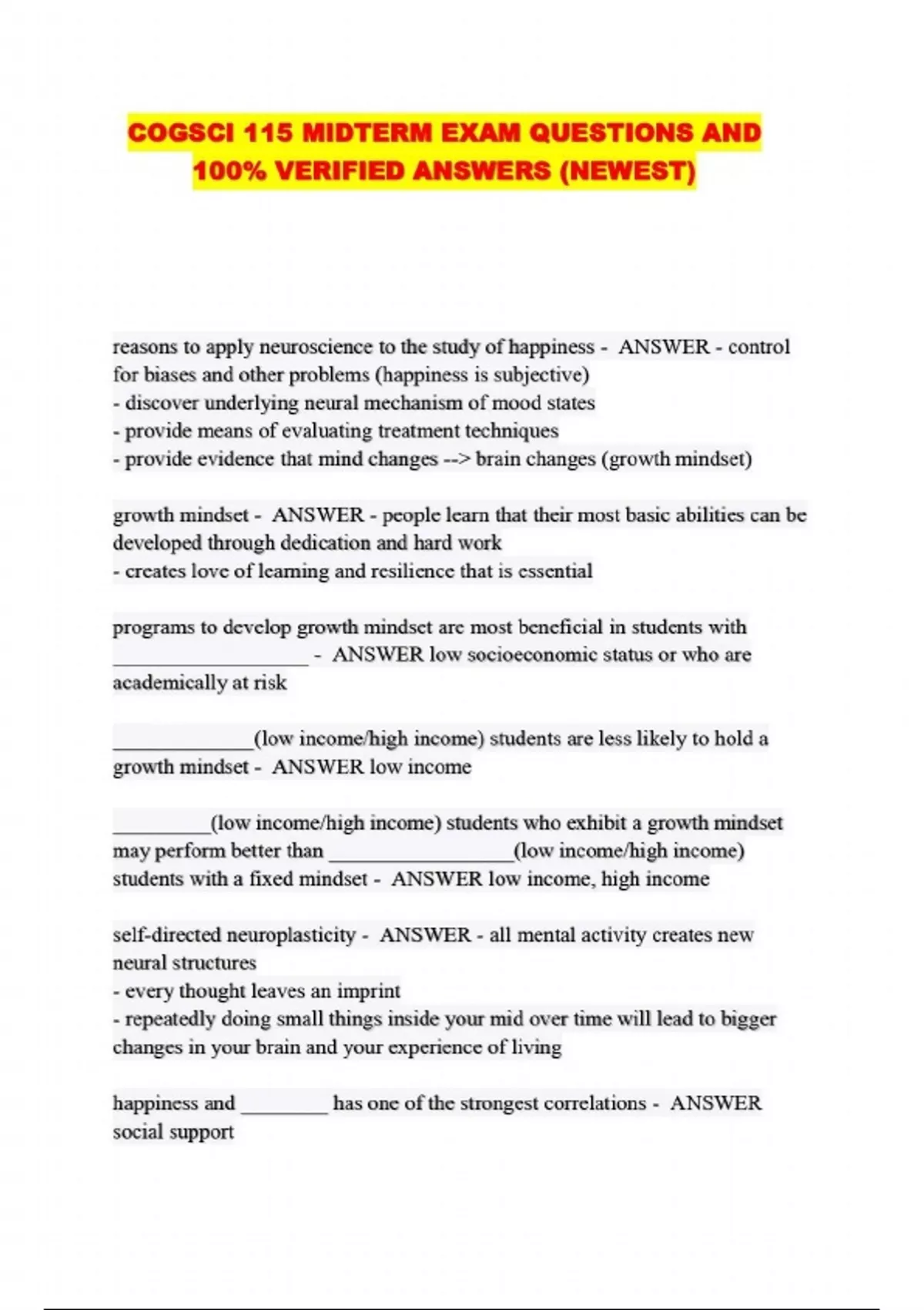 COGSCI 115 MIDTERM 1 NEUROPSYCHOLOGY OF HAPPINESS EXAM QUESTIONS AND CORRECT ANSWERS