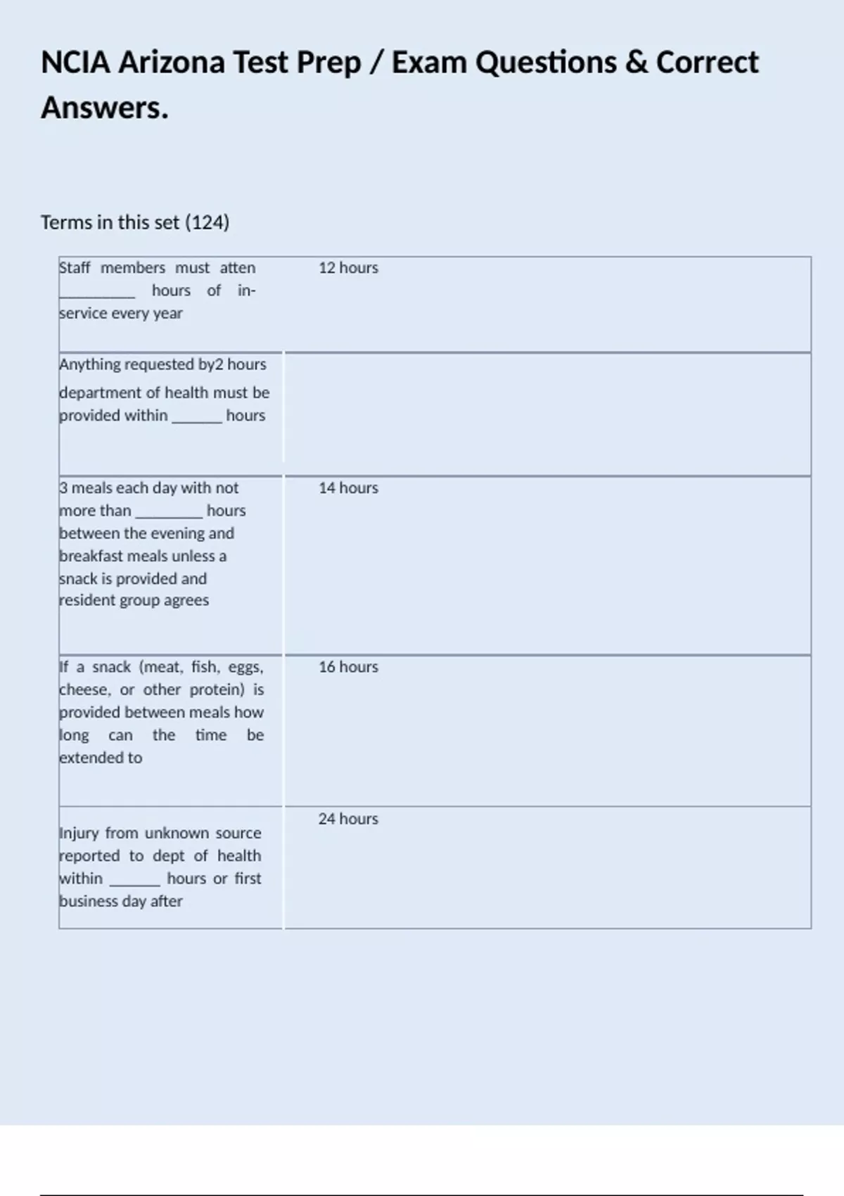 1 Exam (elaborations) NCIA Arizona Test Prep / Exam Questions & Correct Answers. 2 Exam (elaborations) NCIA AZ State Exam LTC Licensing Practice Test PART 1 NUMBERS / Strategies Review of Key Quizzes & Correct Answers.