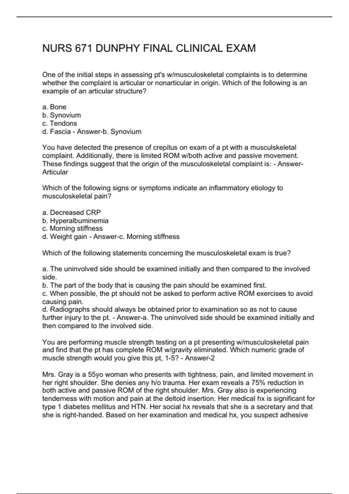 NURS 671 DUNPHY FINAL CLINICAL EXAM QUESTIONS & ANSWERS 2 Exam (elaborations) NURS 671 DUNPHY FINAL CLINICAL EXAM 3 Exam (elaborations) NURS 671 DUNPHY FINAL CLINICAL EXAM QUESTIONS & ANSWERS 4 Exam (elaborations) NUR 671 FINAL EXAM QUESTIONS & ANSWERS 5 Exam (elaborations) NUR 671 EXAM 1 QUESTIONS & ANSWERS 6 Exam (elaborations) NUR SG 671 -