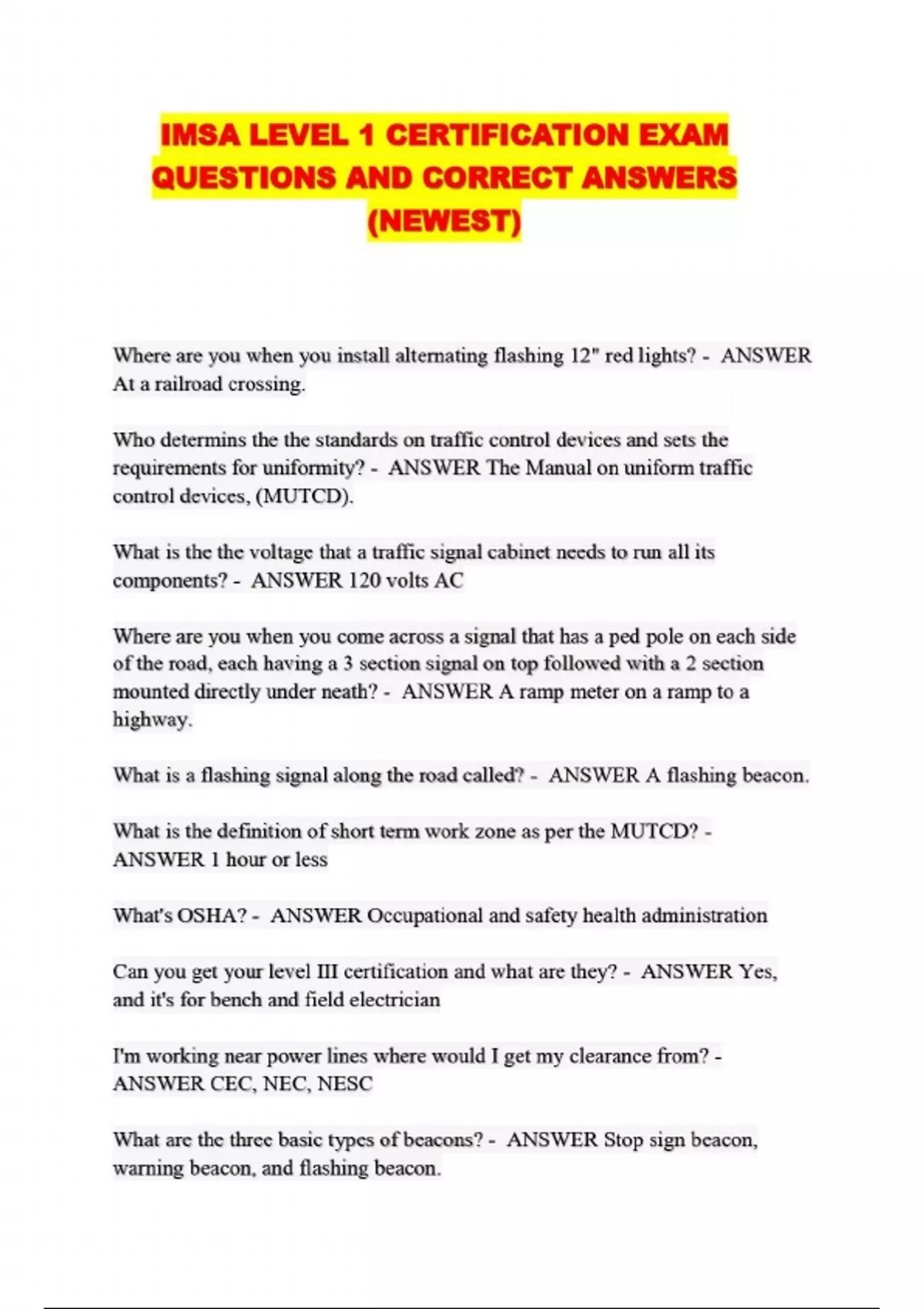 IMSA TRAFFIC SIGNAL TECH 1 EXAM STUDY GUIDE QUESTIONS AND CORRECT ANSWERS