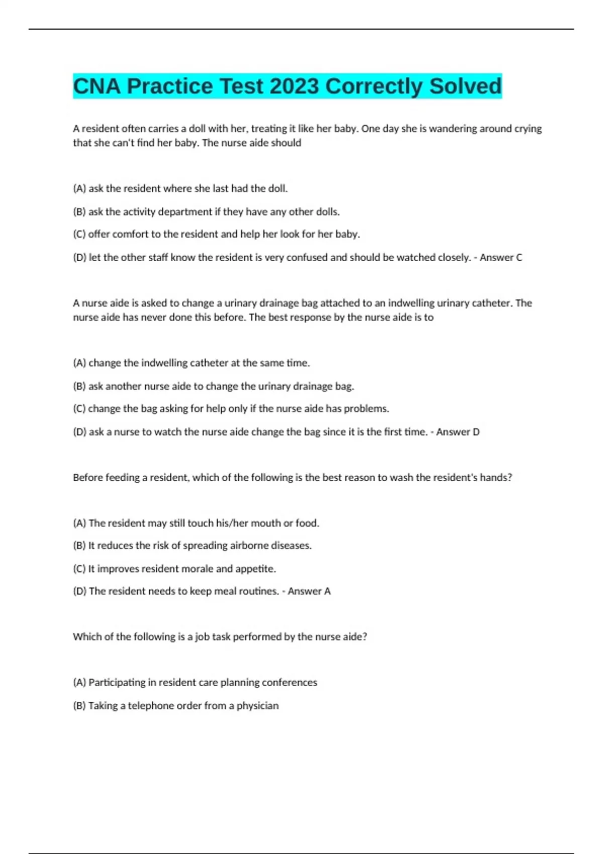 Exam (elaborations) Practice Questions CNA State Exam Test Already Solved 2 Exam (elaborations) Headmaster TMU CNA Vocabulary Test Verified Correct to Guarantee Pass 3 Exam (elaborations) Headmaster Study Guide Questions with Correctly Detailed Answers Already 4 Exam (elaborations) Headmaster CNA Practice Test Questions with All Correct Answers